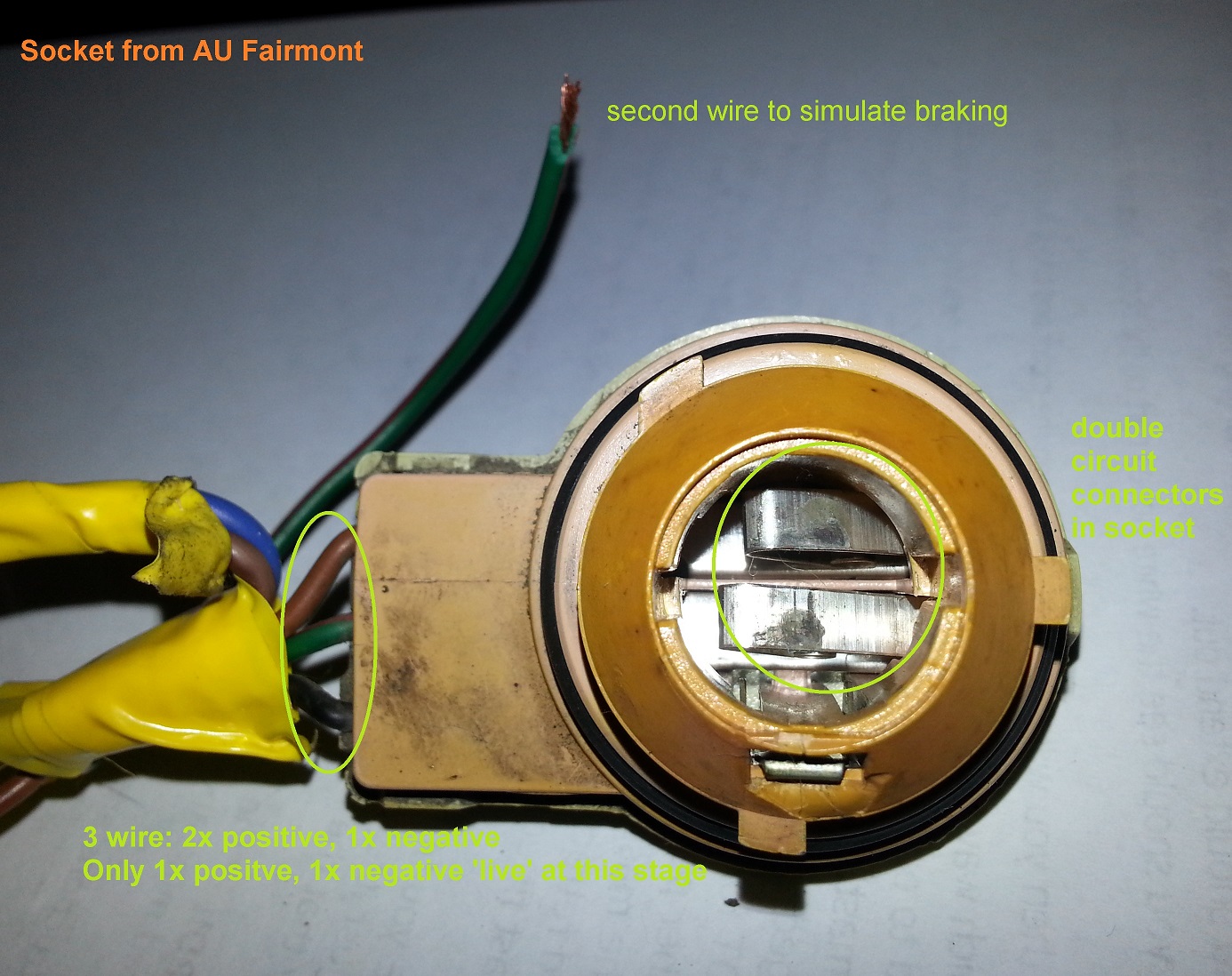 The whole Ghia is on LEDs from cluster, switches inside, map readers, doors, window switches, parking, reverse, indicators (with low wattage flasher), dome, boot - no halogens on this car so I do know something about polarity. However - Timmy - here's some info and pics for you. I also thought of maybe low amps coming through to the parking lights as the CREEE needs 7W but it works in the house with my low power remote control car charger so it doesn't make sense. Im open to suggestions. Here's what I know. It's definitely not BA15S - BA15S are 1156 single circuit lamps and are not keyed for the brakes. I use two of these on my REVERSE lights - and they work like a charm. It wouldn't also be a BA15D - eventhough BA15D is a double filament socket - the pins on the side are at the same height which make them not fit into the AU brake light holder where one pin is higher than the other. These are 2x BAY15D Super Bright "CREE" LEDs. Would it make a difference that they are 7W each? The setup I have in-house is a BAY15D holder from a AUII Fairmont which has two input (+) wires and one (-) wire. By default I have one (+) and one (-) connected up 'live' which simulates - parking lights - ON. If I want to simulate where I press the brakes - I then hook up the second (+) wire to the 12VDC power source. I'm assuming this is how it works with the brakes and it does make the CREE LED work as it should - DIM with parking, BRIGHT with brakes and parking both ON and using the same socket/holder as the one in the Ghia. I specifically like CREE LEDs they're brighter with a more solid design and wiring than the normal LEDs where they melt-out easily. At present I have two 36 SMD LEDs in but some of the SMDs have burned out in only months. Here are some pics for some thought if you might have and let me know, cheers