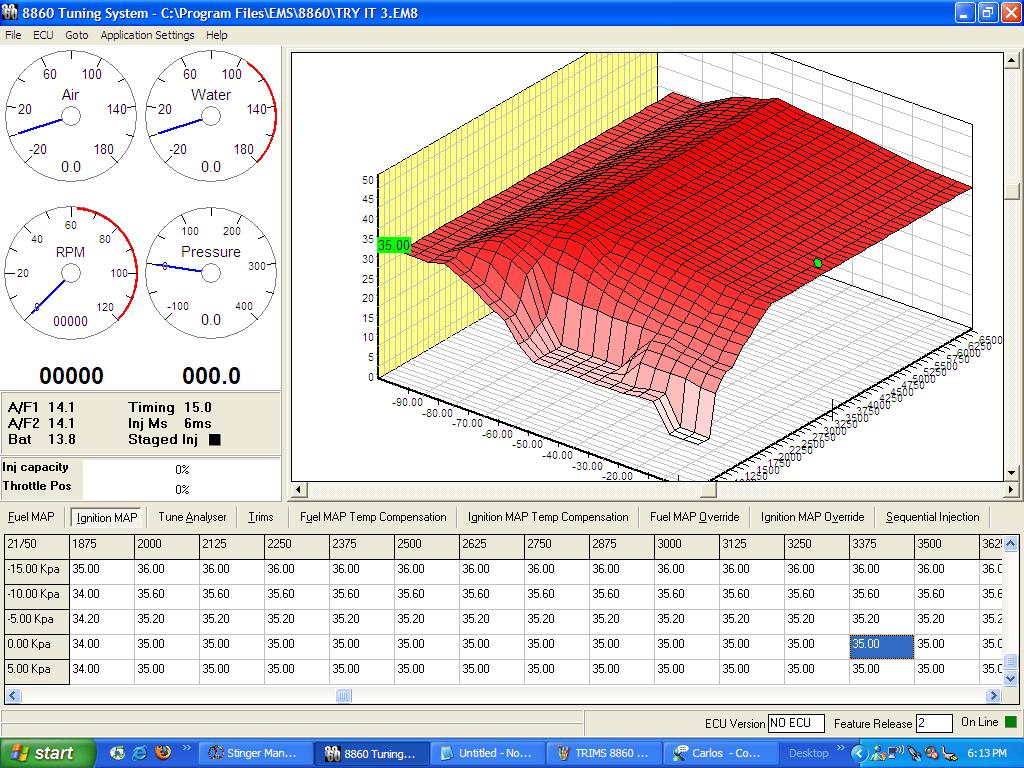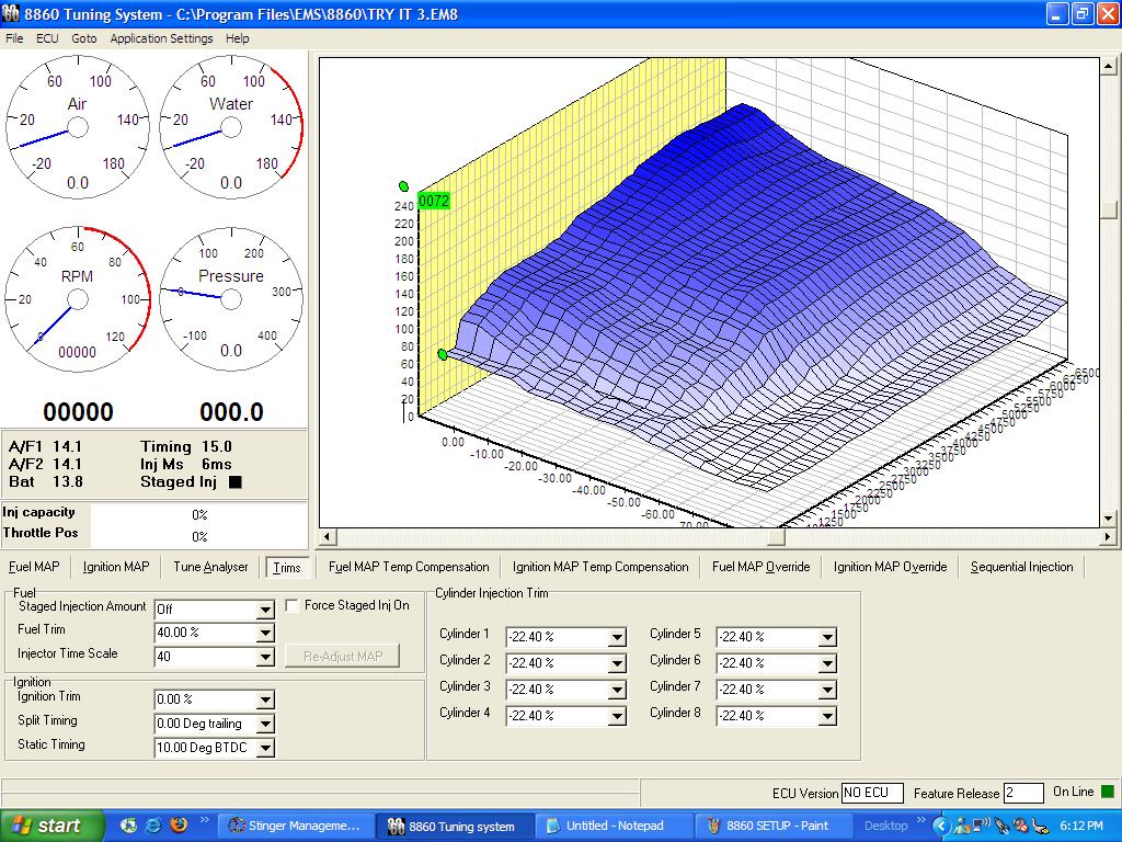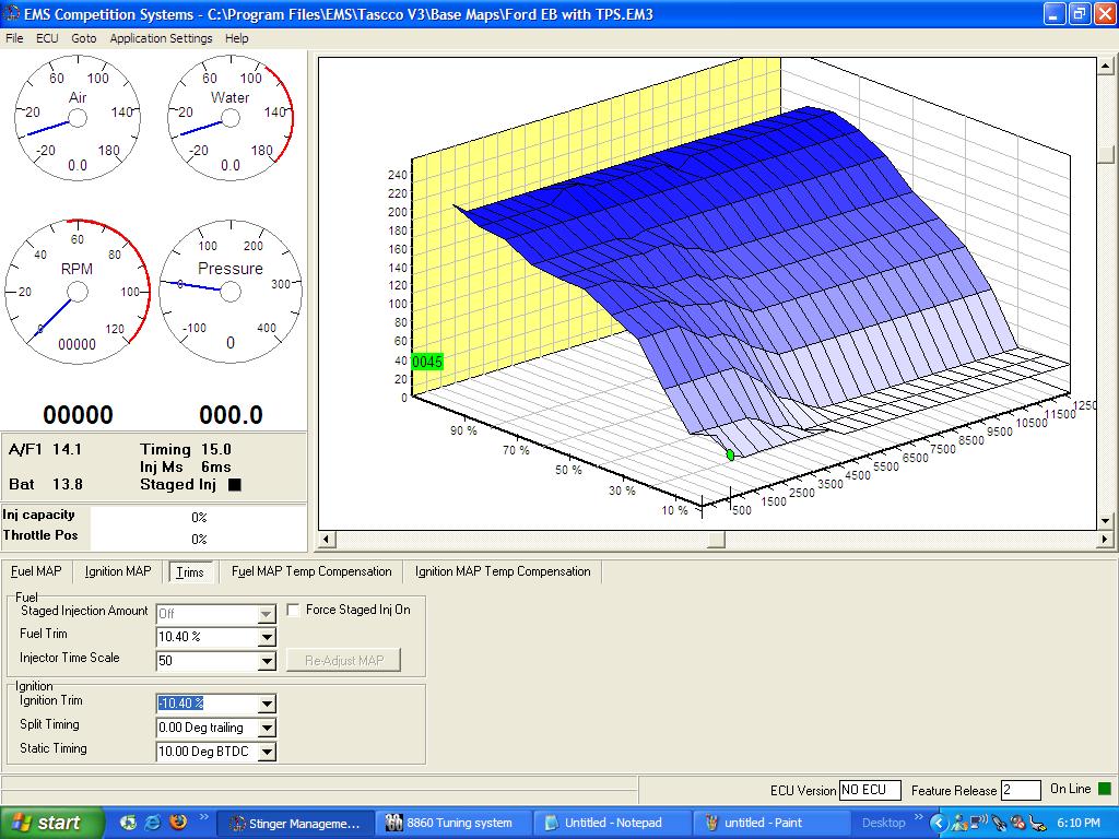 But the syncsensor is set to Mag, Tigger Edge +, No dwell, cold crank 80%, Trigger Pull up resistor ON. Cold start my car is as good as it was with the stock ECU, starts on the 2nd or 3rd crank and idles fine and can be driven straight away. Ingition is similar to the Super Saloons Tuning is thanks to Tony Goodlich. Tony Goodlich here The sync can be set to anything as it is not used, only the trigger is used as EA-ED and EL only have the trigger off the dizzy. Good to see you guys trying to get the most out of the EMS8860. With my turbo ED Falcon I am getting close to 600km out of the tank with a combination of City/highway driving all thanks to the latest tuning software "Tune Analyser" on the EMS 8860. Just tune the cruising points to 15.5 A/F ratio and have 40 to 45 degrees advance on cruise and gives great economy. With over 400+rwhp at the moment its great to have power /economy and drivability all together.