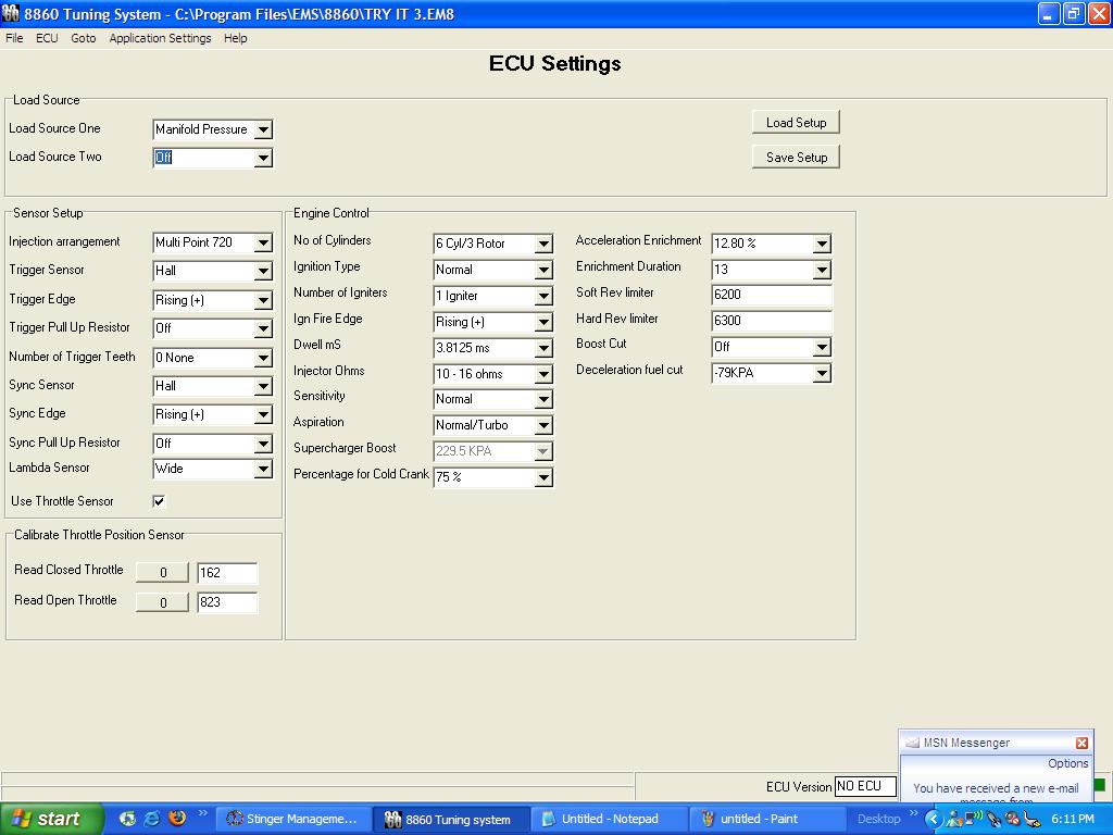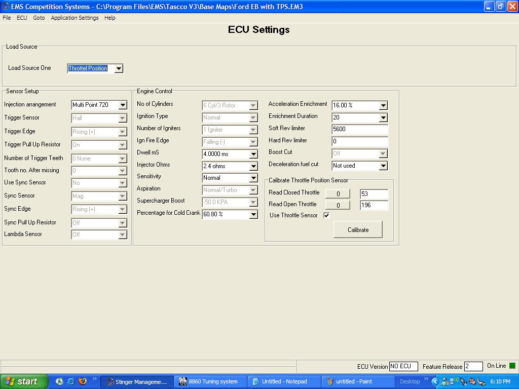 sorry bout all the pics... As you all prob know is that the super sallon TASCO cars use the EMS stinger. I found a base map for the falcon FIRSTLY... note the set up pages, "trigger pull up resistor". Mine is turned off but the SS one is on. Also the difference between the sync sensor, mine is on hall but the ss one is mag and the ignition time scale difference, mine is 40 the ss one is 50 Secondly, check the timing difference! Is it coz one of my settings is wrong? I cant see how there could be that much difference as my EL is simular to the EA/EB's HELP!!!!!!!!!!!!!!!
