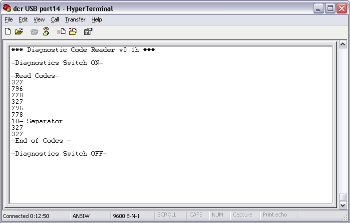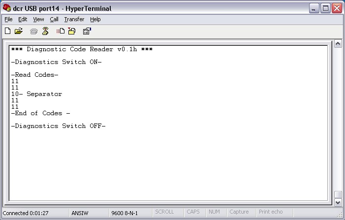 1. plug the PC/laptop into the unit. The USB port, in the unit, is powered from the PC/laptop port. Get Hyperterm working. 2. plug the DCR unit to the diagnostic connector. 3. On powerup the unit will display "dcr". On powerup the banner (e.g.) "Diagnostic Code Reader v1.0" is output on the USB port and displays on the PC/laptop. 4. initiate test e.g. the KOEO test.... Flick the switch on the DCR unit to ON. "On" is displayed on the LED. "Diagnostic Switch On" is sent on the USB port. Once the first valid pulse is detected the LED displays "---" and "Read Codes" is sent on the USB. Codes are displayed on the LED and sent to the USB port simaltaneously (unit will beep at each new code). One would need to write the codes down in conjunction with each notification beep if no PC is connected. Once no more codes are detected "End of Codes" is sent to the USB. 4 secs later "End" is displayed on the LED. 5. At this point the unit is still in read mode if KOEO tests are initiated, or, the diag switch can be set to OFF.... if the Diag Switch is set to Off then "Diagnostics Mode - OFF" is sent to the USB and "dcr" displays on the LED. I set this up on the basis that the unit would be used stand-alone more frequently that with a PC connected. I actually did consider creating a "stack" to store the codes but did not develop this. Thoughts ?? |