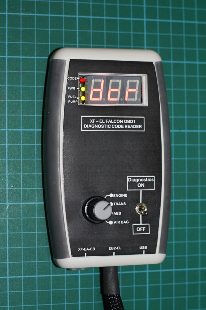 Announcing the LED Display version ...... DCR - Diagnostic Code Reader I had, sporadically, been working on a LED display version of the Code unit for sometime....however, it had spent most of the time on the backburner. Anyway, quiet time at work off and on over the past few months and I had 6 or so projects on that backburner so I have attacked some of them. Had three automotive ones - Speedo corrector, Thermofan controller (EL fans into EA-EB-ED) and the LED Diag Code Reader. Finished all of them The LED version has been completed .... as a prototype at this stage. i.e. ..... It Works !!! Details:- - 3 digit LED display - Three LEDs on the left of the display show Power On (green), Fuel Pump control status (yellow) and the code pulses (red). - Reads the slow codes (chose not to do the fast codes... fast codes to not send the Memory Codes, plus more complex with more buttons needed). - Reads 2 and 3 digit codes and has been tested on XF, ED, EF, EL and XH so far (eng, trans, ABS across these). - Automatically detects 2 or 3 digit codes. - Automatically detects the different models - Did not go to LCD - much more complex wrt displaying additional info of Code details - decided to look at this (maybe) later. - Implemented a USB port interface to PC. - There is also a 4 pin plug for connection (via an adapter cable) to XF, EA, EB. On Connection "dcr" for Diagnostic Code Reader is displayed. When Diag Mode switch is set to On the display is "On" First valid pulse changes the display to "---" The Codes are displayed on the LED one at a time. These is a short beep each time a new code is displayed. Separator is displayed as "10-" "End" is displayed after last code. The USB connection works as a COM port on the PC so any terminal program can be used (e.g. Hyperterminal). Am running the USB at 9600 which is default in XP. Next steps:- Still doing a bit more testing (need to confirm EA/EB - but if it works on XF and ED and EL then there should be no issue). Need to get front label artwork and get a batch of labels manufactured. Order in all the bits Make jigs to machine the cases. The sexy curvy case I am using will be black in the production version. I did not add a DB9 (COMport) connector due to lack of space. Anyway... will keep yous informed.