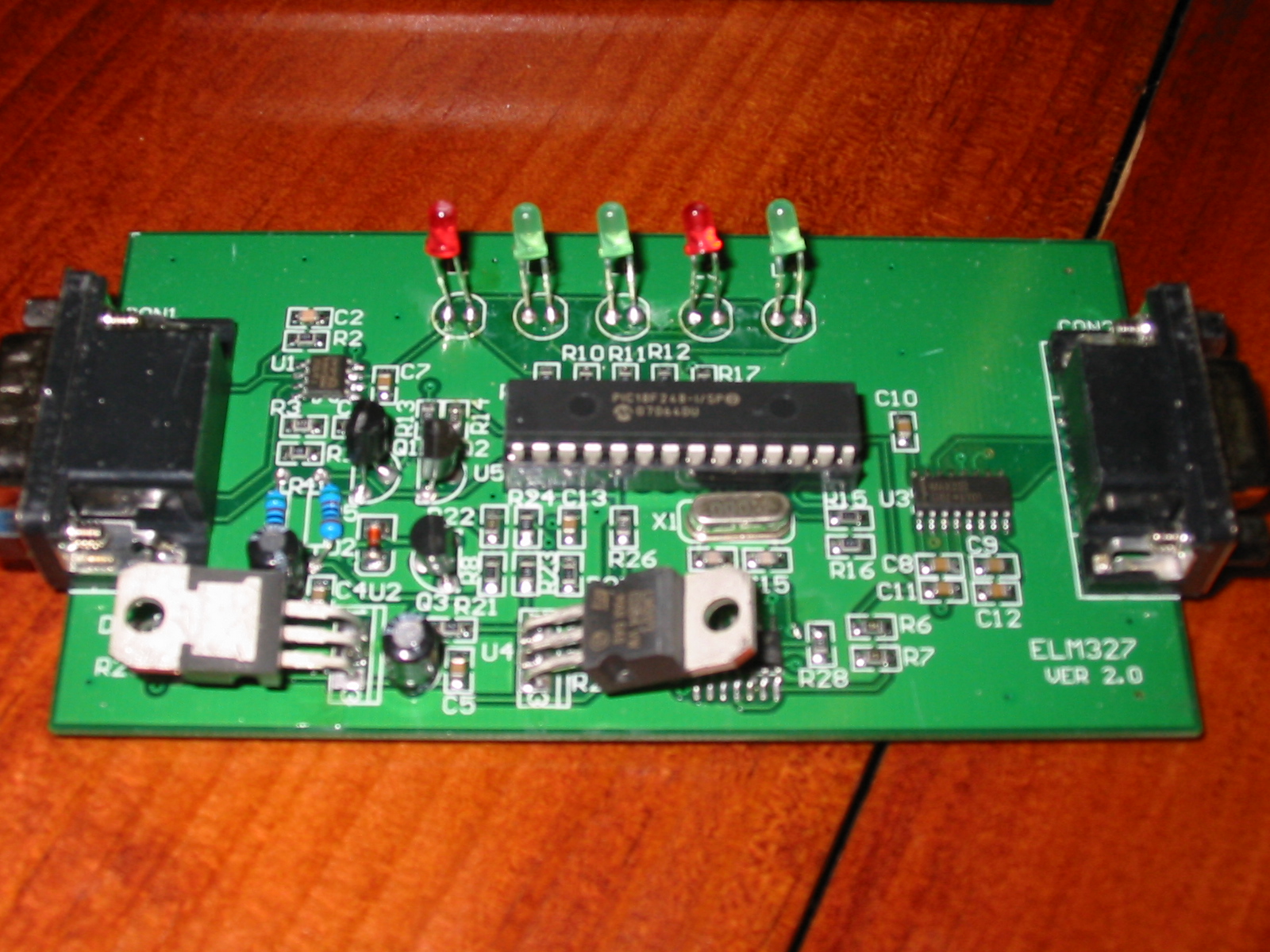 The v2.0 on the PC Board is the version of that board, not the version of the ELM chip. The only way to really tell the ELM version is to see the result of the ATZ or ATWS that I suggested above. The 8n1n seems right. Sounds to me like baud rate if you're not communicating to the tool. Many of these units ship set to 9600 bps by default. But try both 9600 and 38400 to see if either work. That jumper on the circuit is for hard-setting the baud rate to 9600 or to the 'high' speed, which by default is 38400. Luke |