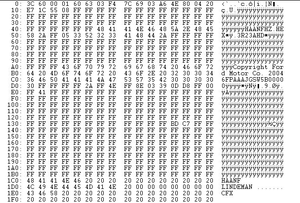 Once again, on an elm, set headers on (ath1) and set header address to the PCM (7e0). Then issue the query to get the model type: 23 00 01 00 54 00 04 My response was: 07 e8 05 63 33 52 37 33 00 00 Or 33 52 37 33 = 3R73 Version query is: 23 00 01 00 58 00 04 My Response 07 e8 05 63 42 46 20 2a 00 00 Now, I don;t know about the 20 and 2a, but the first two characters are BF - which is what I have, a 3R73-12A650-BF PCM Flash mapping (SX Territory AWD) There is also another set of data just before all this, which is of the form: 23 00 01 00 46 00 04 23 00 01 00 4a 00 03 This returns: 07 e8 05 63 48 41 41 50 00 00 07 e8 04 63 41 42 32 00 00 00 Which using the same ASCII conversion comes out to HAAPAB2. It just so happens that the filename from that spreadsheet for my PCM Flash is HAAPAB2.... Lukeyson Borrrrrrrrrrinnnnnnnng.. It would be easier if i attached this screenshot of the "VID block" Left column is the Hex address.. Add 0x10000 to them.., ie 0xC0 + 0x10000 = 0x100C0 = Start of VIN 0x10046 = start of filename 0x100C0 = Vin After the vid block there is various encoded bytes which represent speed limitor, axle ratio, axle type.. etc.. 0x101C0 = Strategy 0x101D0 = Guy who released it for production (i believe) ps.. thats not really my vin number