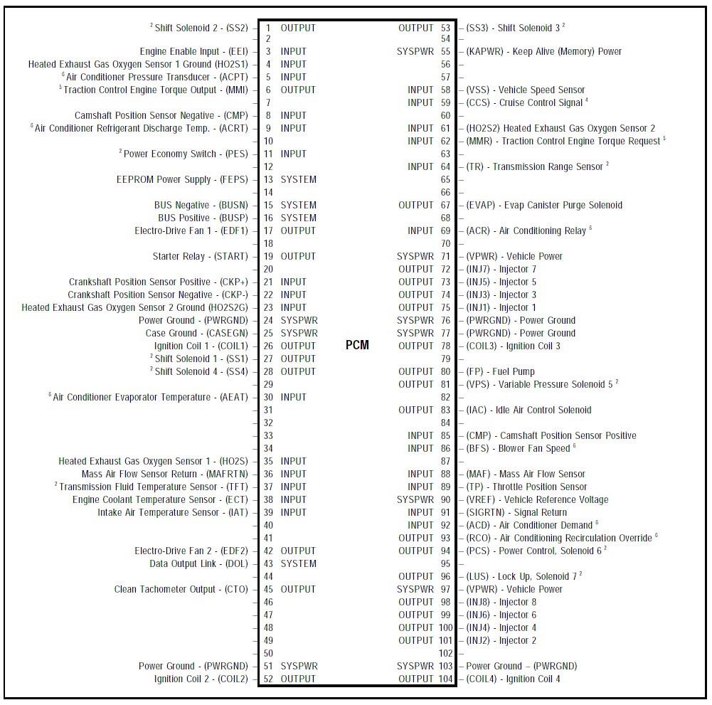 Will get around to scanning in some wiring diagrams if you need them. ON my other document I have.. Pin Description 2 Diagnostics STO 3 Enable Engine Input 4 Oxygen Sensor Ground 10 Air Con Clutch 17 Engine cooling fan relay 1 23 ignition ground 24 power ground 25 case ground 30 air con evap air temp sensor 34 trans temp link 35 hego sensor 1 36 MAF ground 38 engine coolant temp sensor 39 intake air temp sensor 41 air con clutch 42 engine cooling fac relay 2 43 data output link to TCM & instrument 45 tacho signal 46 engine cooling fan relay 4 47 EGR solenoid 48 ignition diag monitor 49 dizzy PIP 50 Spark Ou (Spout) 51 power ground 55 keep alive power 58 VSS input 61 HEGO sensor 2 64 auto trans range selector/ Neutral drive switch 65 EGR valve position sensor 66 Diagnostics STI 67 Canister purge solenoid 68 engine cooling fan 3 69 air con relay 71 main efi relay power 72 fuel injector 7 73 fuel injector 5 74 fuel injector 3 75 fuel injector 1 76 power ground 77 power ground 80 fuel pump control 83 idle air control valve 86 a/c heater blower fan 88 MAF sensor signal 89 Throttle position sensor 90 ref voltage 91 sensor ground 93 air con recirculation override 97 main efi relay power 98 fuel injector 8 99 fuel injector 6 100 fuel injector 4 101 fuel injector 2 103 power ground. I probably have more written down in my project book. if you get stuck on a particular pin I can dig it up. Do you need the pin outs for the auto TCM? Hope this helps!