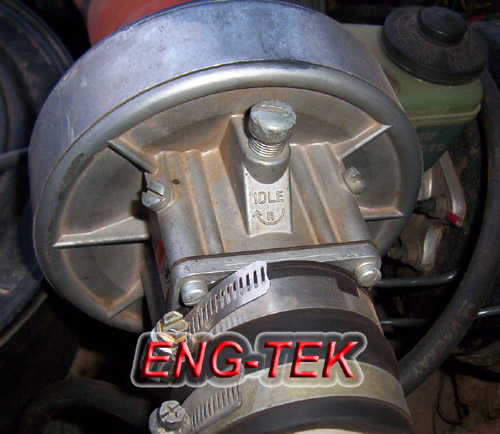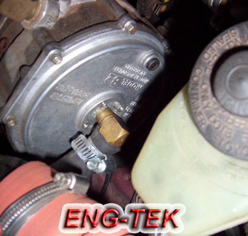 I have attached a pic of the IMPCO 225 mixer. The idle screw is the one on top. For those with forced induction, I have included a pic of the balance tube connecting to the regulator. You DO need the metal top plate for the convertor, otherwise the pressure (boost) will cause it to leak & eventually crack. Thats a 1/2" balance hose I've used. This keeps the mixture consistant across most of the rev / load / boost range (low boost for continous duty use). Dave {DESCRIPTION}