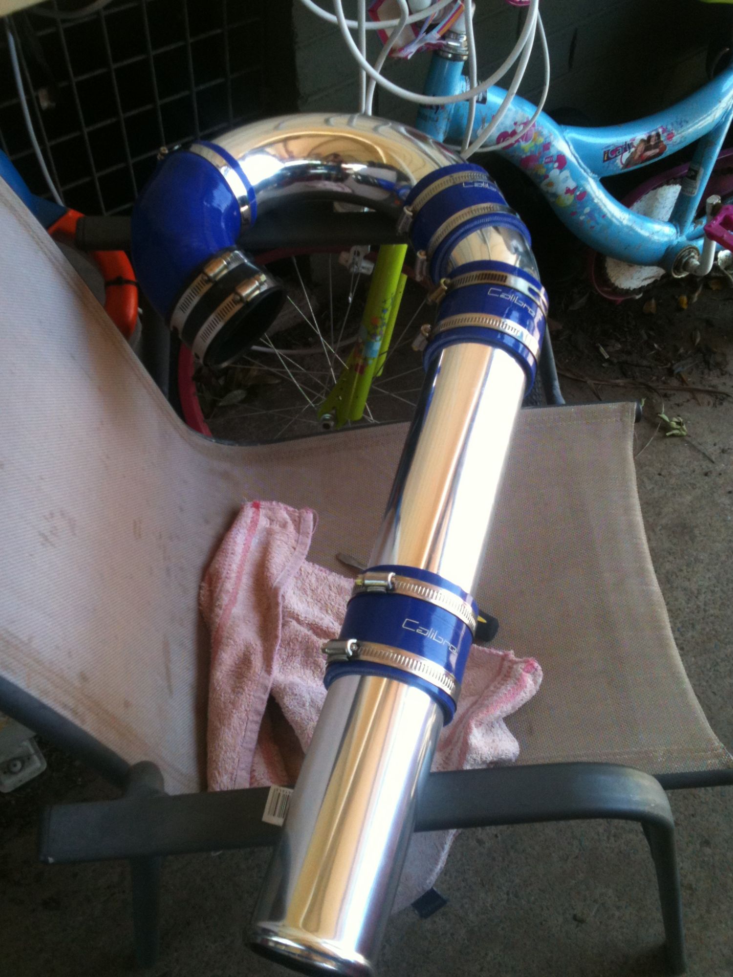 heres mine, went to super cheap and made up a intake pipe from a 180deg bend (had to cut a bit off the end), 3 silicon joiners, 90deg silicon join and 2 straight pieces off 3" pipe, also used the ef join the goes from throttle body to intake cos the 3" silicon wasnt big enough to fit over the throttle body, also have a pod in the box, and the silicon join rubed on the bonnet so i put some foam where it rubbed and its all good