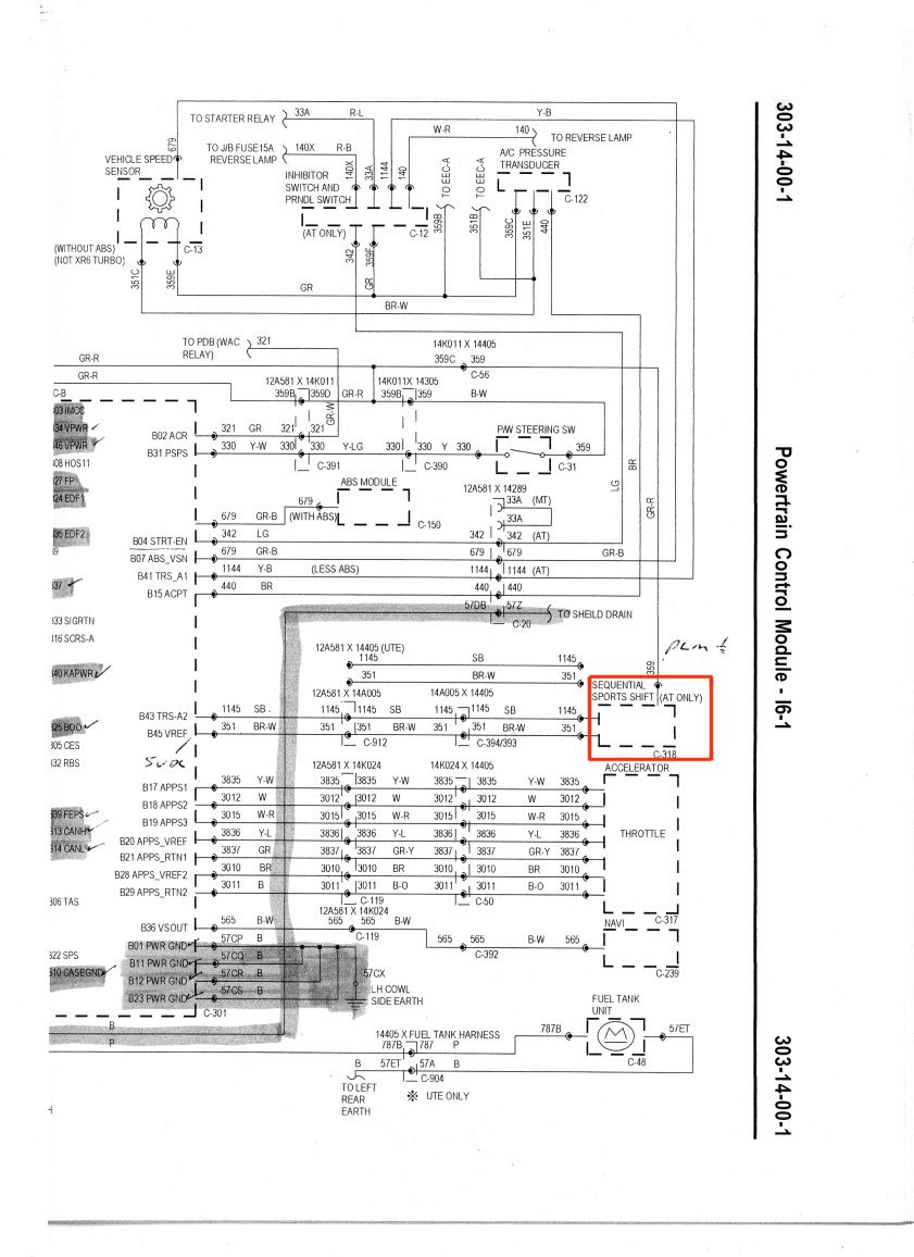 What i have in the car is a plug with four wires (one spare) running from the main loom and finishing just near where the shifter is to be mounted. I decided to run a multimeter across these three wires, one wire reads 5.05v, the second wire reads 5.05v and the third wire (which i assume is the PCM earth) reads zero. I have attached longer wires to the PCB on the shift lever to make testing a bit easier. The three wires on the shift PCB are blue, green (red trace) and brown. The green/red wire i assume by the diagram is an earth to the ECM, the blue wire should be connected to ECM pin B43 and the brown wire to be connected to ECM pin B45. Connecting these wires from the shift PCB to the loom running to the ECM and activating the tiptronic mode on the shift does absolutely nothing. I tried testing the shift circuitry with a multimeter but was unable to get any readings. What can i do to see if the PCB is faulty? I have attached a wiring schematic straight from the Ford worshop manual, hopefully someone can point me in the right direction as to what i'm doing wrong. If i have done everything correctly, i'll have no choice but to take the car back to BPT to have the problem sorted =( Attachment: Thank's in advance for any help you can provide |