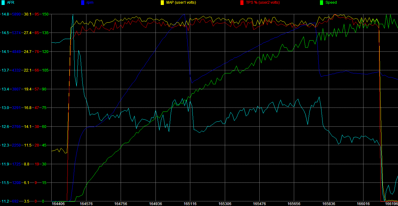 - Is this a detonation issue? That is, is the knock sensor retarding the ignition in 3rd gear? If so, why? It's not running significantly hot, and always has 98-octane in the tank. Besides, it doesn't do it in 1st or 2nd gear. Also, I would have thought 12.4 AFR should be rich enough to suppress detonation in an N/A engine if it is starting to creep in in 3rd gear. And I can't hear any detonation, but at 145 kmh I'm not sure that I would be able to hear it even if it was happening.