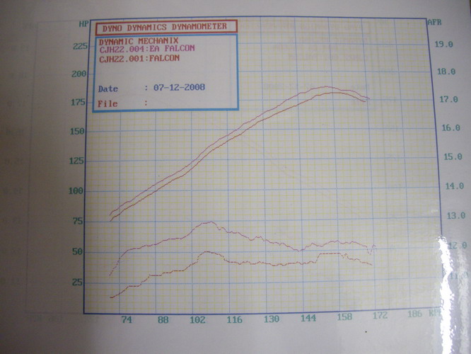 It's been a while, but the ED has the old EA head and cam and valve springs, an ACL Monotorque head gasket, std cam timing, 3" pod filter, log manifold, etc, and the piggy back but not tuned at the time, and I made 150rwkw, with the 5sp EA box and 3.27 LSD with the 235/60R15 tryes.