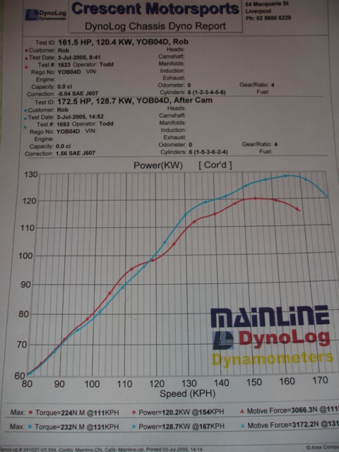 although joe has said auto in the post above my car is actually manual. Previous mods: pacemaker extractors, std cat, 2.5" exhaust with 2 mufflers, thermo fans and xg snorkel. 3.27 diff ratio, std filter and 296,000 kms. first run on the dyno resulted in 161.5HP, 120.4KW @ 154kph in 4th gear. i have run before at wsid and have done a 15.7 1/4 mile, i will run again hopefully within the next month. Then the cam was installed with many thanx to dave(mre40l), tony and joe, with no real hiccups and fired up first kick, we let it idle for a while to bleed the lifters and then went for a quick run around the block before putting it back on the dyno again. second run on the dyno saw an increase to 172.5HP, 128.7KW @ 167kph again in 4th gear. max torque went from 224nm @ 111kph up to 232nm @ 131kph, at the same speed (131kph) with the original cam the new cam made around 25nm more, very noticable on the street. real world (on the street): i noticed straight away the difference under light throttle excelleration, definetly pulls stronger when just driving normal. this should equate to an actual saving in fuel if not driving flat out. when i nail it now it definetly pulls much stronger through the midrange and has moved the power further up the rev range, where it used to taper off before around 5000rpm it is still pulling all the way to 5600-5800rpm now. the idle is slightly lumpy but nothing you would really notice and the only issue i have had so far is i am having trouble with the idle speed controler dealing with the idle for the moment, but a quick reset of the base idle has improved it already and with a bit more mucking around im sure it will be sweet. overall i am happy with the improvement and would recommend this cam to anyone looking for the next step from exhaust and cai without wanting to go wild, std ecu and injectors and your mrs can still drive it to the shops without whinging about it being a pig and keep good economy.