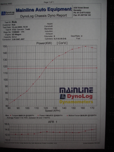 Firstly a big thanx to Joe at Crescent for the time and effort put in to this car, even though this is a trail for his cam and advertisment for him joe didnt have to go the extra yards of staying back on a saturday to fix my brakes and a few other issues, cheers again. compared to the first run after the cam was installed we have redailed in the cam to retard it a little from where it first was installed, and put a heap more ignition timing into it (still not pigning though). in all with only pacemaker extractors, std cat, 2.5" exhaust, xh snorkel and 297,000kms on it, std computer and injectors, ngk spark plugs with bosch leads and thats about it we got 148.4rwkw, an improvement of 28rwkw over the std cam. just over a 23% increase in power. to say im pleased is a bit of an understatement, im stoked. it feels so much better on the street and i cant wait to see what time it gets on the 1/4 now, i will try and get to wsid within the next few weeks. cheers Rob.