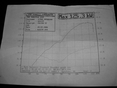 It is possible though that the leaner mix might be tripping the knock sensor and the ecu has pulled a lot of timing out which will cost you power. Hard to say though, what do other falcons normally pull on that dyno?