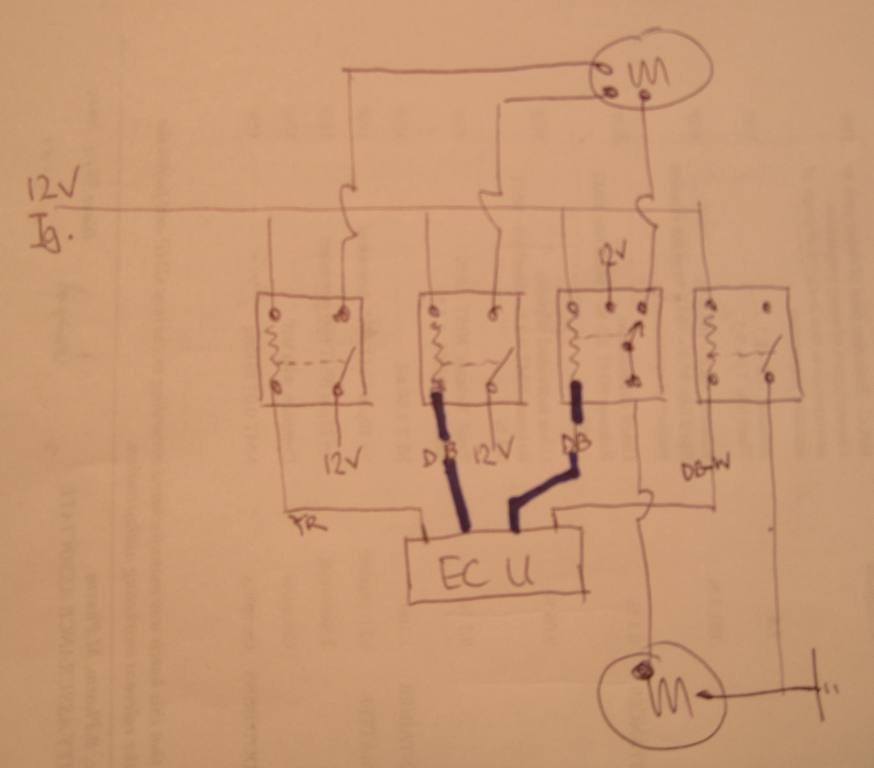 Drew a rough circuit diagram. There is a siganl wire for each relay from the ecu. Two signal wires are the same colour, dark blue, shown thick in the pic... Generally when wires are the same colour they do the same job Does the ecu trigger both these relays simultaneously? doubt it. Attachment: