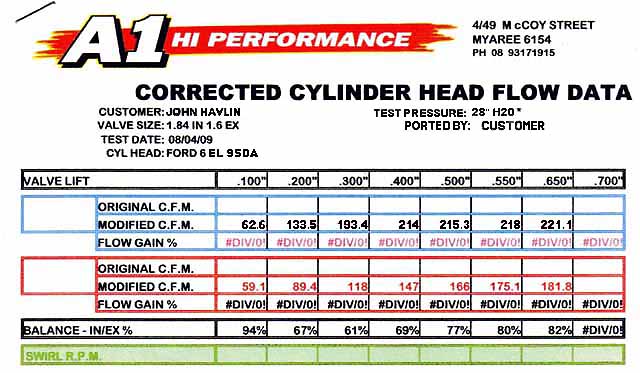 Spoke to the Guy who flowed my head today (someone else droped off and picked up the head) and asked if he had any flow figures for a standard head, unfortunately he has been running a new flow bench for the last couple of weeks so figures wont be comparable, he did say that the flow testing he has done with the new bench it is generally reading 5cfm lower than the old one and that standard heads have flowed between 180 -190cfm at .500" on the old bench, add 5cfm to my .500" figure and you get 220cfm so a gain of around 30 - 40cfm compared to standard. He also explained to me about the swirl figures he supplied on another chart and how the swirl jumped extremely high at the same time the cfm dropped off, he said some swirl is good and to much robs cfm flow. I will be speaking to him more about how to reduce the swirl at higher lifts, it shouldnt require to muck work as the swirl only jumped high in the .400" to .500" range of lift.