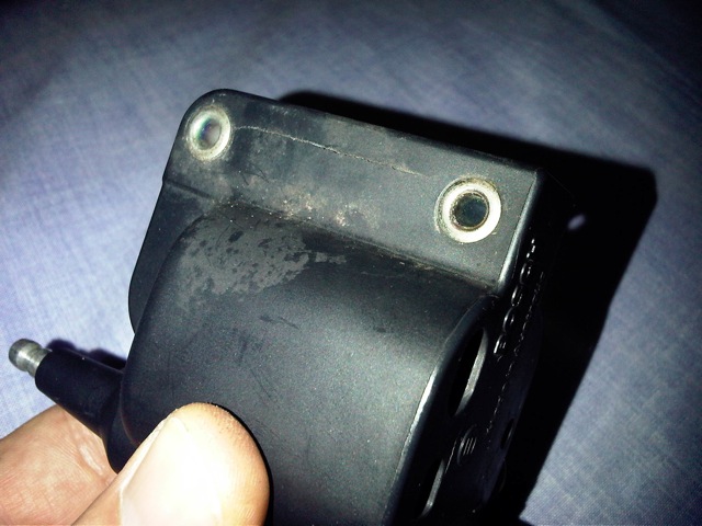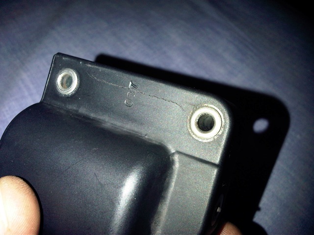 Look at the photos of the Bosch coil. It seems faultless until you remove the 2 brackets which expose 2 long hairline cracks. THIS MUST BE A DESIGN FAULT! The coil is bolted on the engine block under the inlet manifold in a position which would expose it to high temperatures (not just the engine heat but road heat as well on a hot day). The expansion and contraction properties of the metal brackets and the plastic casing are different and probably account for the cracks! One good rainy day, a puddle or an engine wash will suffice in damaging the secondary high voltage coil. I thought of putting the new coil near the windscreen washer reservoir. This way I would not have to lengthen the cable that connects to the distributor cap. Have any of you have any suggestions ?