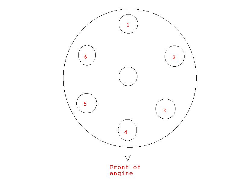 Usually number 1 lead is the one closest to the corner of the timing cover and hte block, and clockwise from there 5,3,6,2,4.