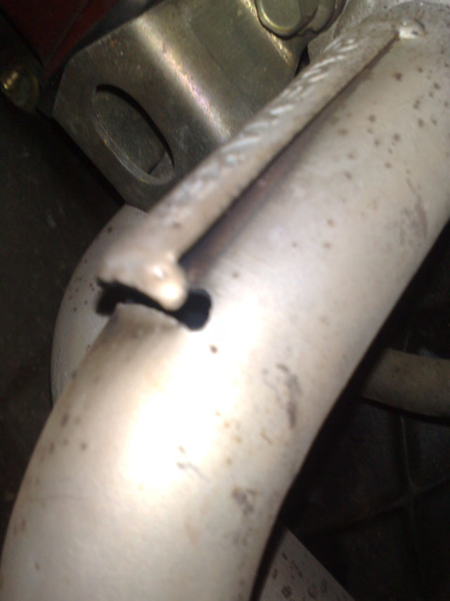 {USERNAME} wrote: Hey guys, have any of you seen this? Attachment: 24062009603.jpg Attachment: 30062009618.jpg The weld has broken and there is now a hole in the headers. When revving you can see blue flames through the hole, and it backfires a lot, also sounds like crap. Is this something that will be able to be fixed up and re-welded? cheers YES,but may have to remove the plate and oxy weld the holes,but i wonder how thick the pipe is at that point.the thinner it is the harder to weld.