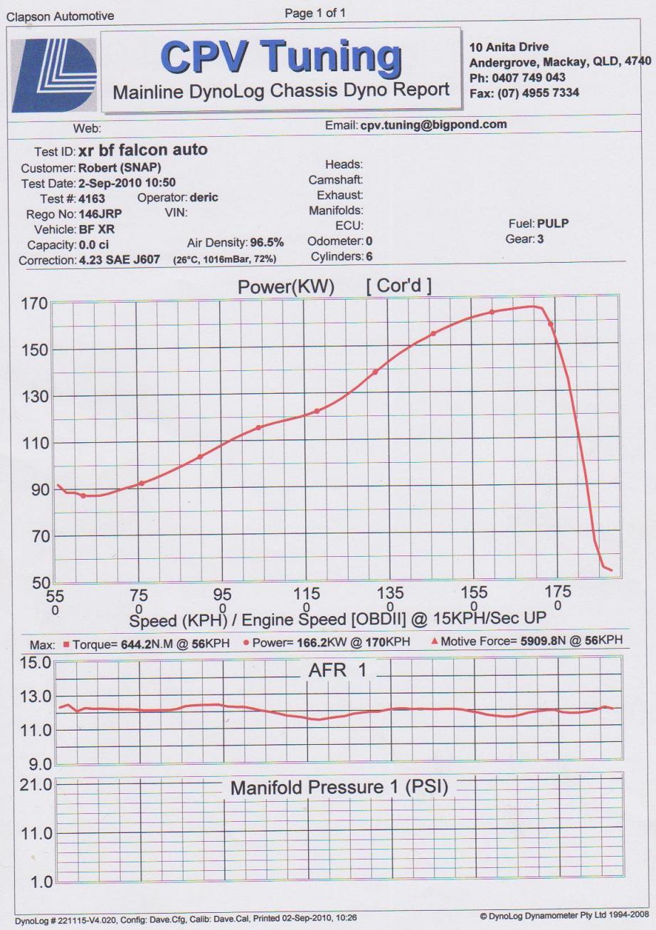 {USERNAME} wrote: I was just comparing my readout - mine seems ok I suppose for what it is. what model engine is yours mate ? I kept getting wheel spin at the top end so I should get a bit better . I think there is a FG XR6 on here with 200+rwkw, not sure what difference there is between the BF-FG though. Mine is a stock 170,000 km EF bottom end, EF head (home ported + 30thou shave) surecam regrind, double valve springs, AU head gasket. |