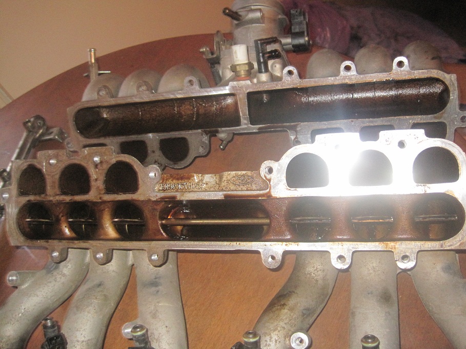 the manifolds get oil inside through the pcv and the top half gets stained from the oil and oil vapour that goes into the throttle body from the rocker cover breather...