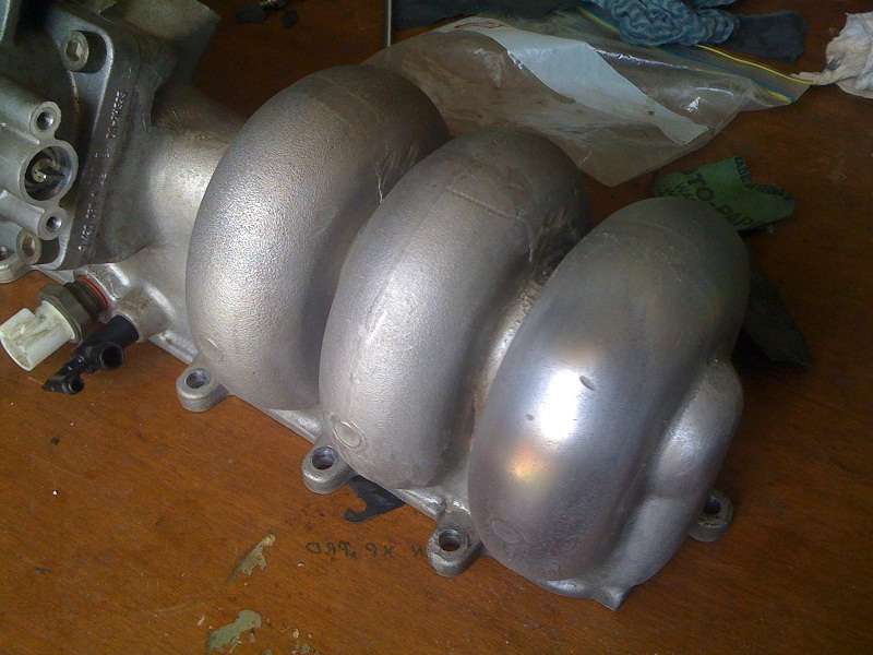 I've just done a lot of work on my car in this area. Fortunately for me, I managed to buy someone else's project manifold, which had been ported (lower half only) and smoothed somewhat inside on both halves. I got it as an unfinished project and just gave it a tidy-up - most of the work had been done with a die grinder. I gave it a clean in a hot caustic wash (Robowash machine) and then it was ready to paint. I painted it because I don't have the time or patience to polish the thing. I used heatproof paint over engine primer.