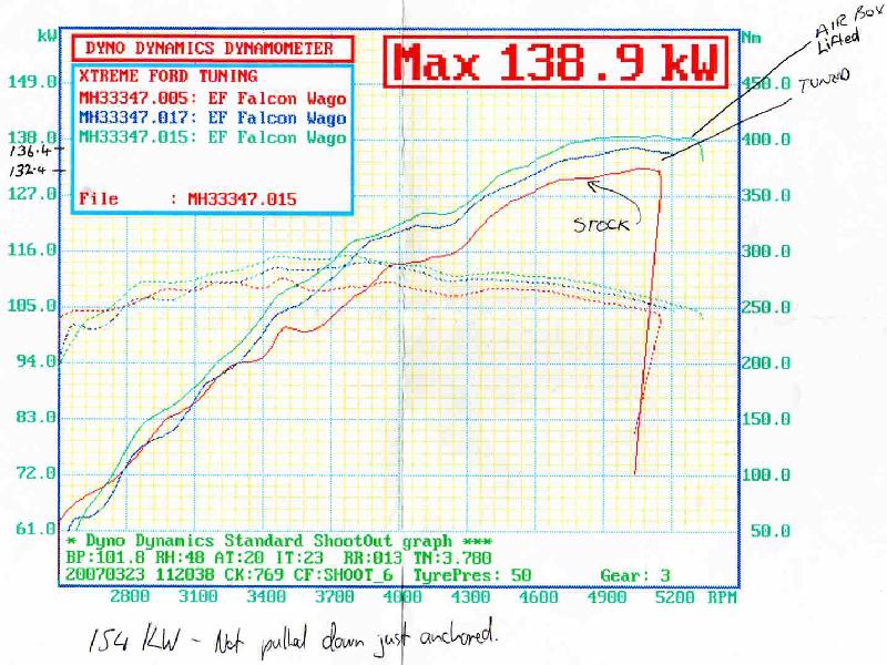 My Dyno sheet for what its worth. Red is before (132.4 rwkw). Blue is after tune (136.4rwkw) Green is with airbox lid lifted (138.9rwkw). Also did another run with the car anchored so it wouldn't move forward but not pulled down no pressure on the tyres at all, got 154 rwkw.