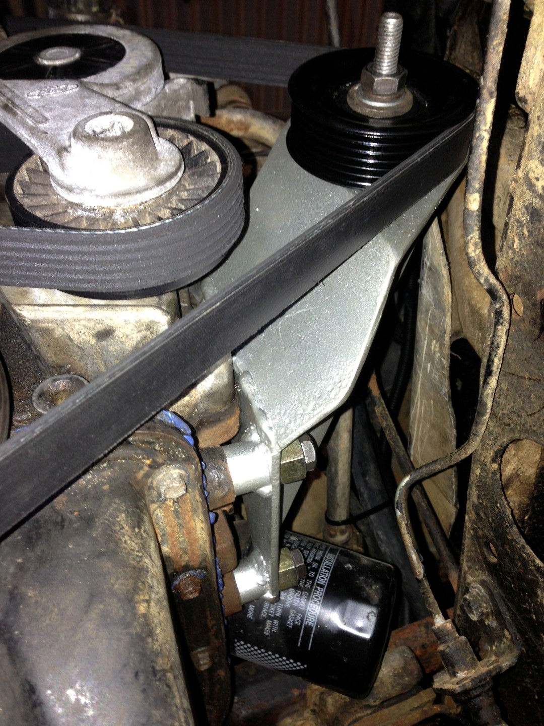 I have an EF I6 in an old FJ40 Landcruiser. When I installed the motor I had to delete the compressor as it hit the chassis rail. I was in a hurry to get the thing going so I removed the falcon auto tensioner and made a simple manual tensioner for the belt and it worked ok for a while. Over time this tensioner has come slightly out of alignment and during more spirited driving will tend to either throw or shred the belt. This had become a more common occurrence since I turbo charged it... I finally decided to sort it out and referred to this thread about the genuine idler that mounts in place of the compressor. I suspected this wouldn't work for me as it would likely put the pulley in the same place the compressor was and also hit the chassis rail. I got one in and found out I was right. After paying $200 for it I decided to send it back for credit rather than modify it. So I decided to make my own and position the pully an inch or so higher so as to clear the chassis. It now it runs the original EF auto tensioner and standard length belt. Pics below for your interest. Attachment: Attachment: Attachment: Attachment: Attachment: Hope this helps someone. Oh, nuts under bolts are temporary spacers until I get the right length bolts. |