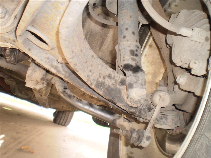 This oil spray I noticed on the front suspension. This could have been blown onto by the fan, so I'm not sure if the leak is from the tensioner or blown o ring near the power steering pump, I could be wrong.