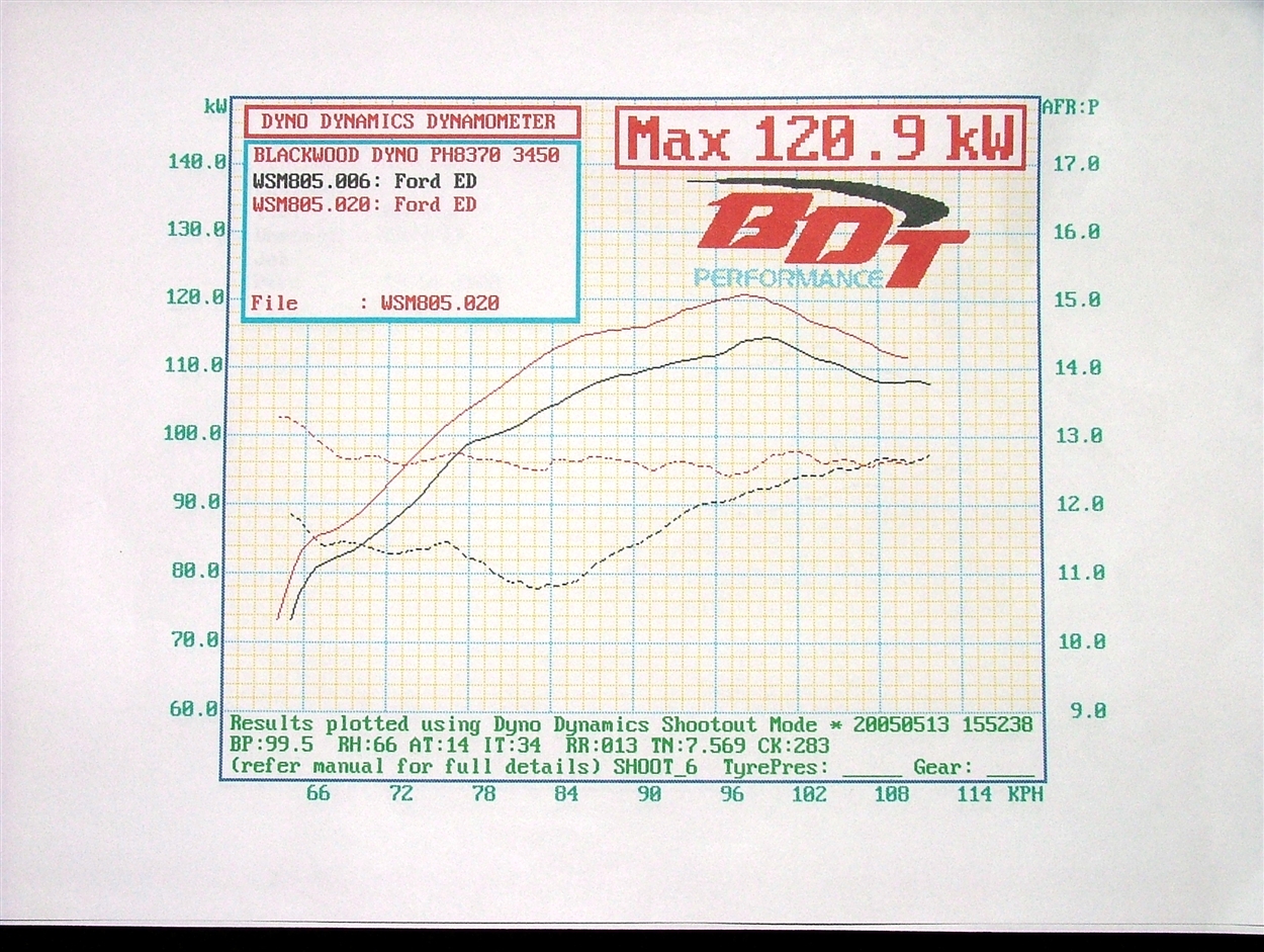 The stock car on that graph made 108 dead stock, and similar cars with just and exhaust made 117rwkw (on the same BDT dyno) The Stock car is a 1997 EL 6cyl auto The 1521a car has wade 1521a Crow springs Pacy 4480's Redback 2.5" cat and catback