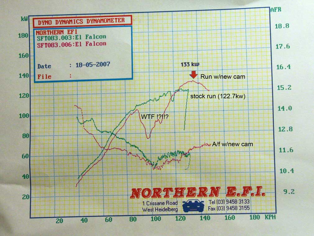 the picture tells the story - car appears to have picked up a few KW in the top end (and you can definetly feel it), but lost power over most of the rpm range, with a huge hole in the midrange. it doesnt feel half as bad as it looks on the graph, but there is definely a flat spot around 3500-4000 rpm. couple of questions: should I have picked up a bit more midrange power? would wacking the variable gear i have on and playing with the cam timing make a huge difference? any others with the rpdrspec3 got charts to compare? what could be causing the big drop in midrange power? the dyno guy couldn't think of anything obvious. he ran it about 3-4 different times and got the crazy graph each time. I haven't checked ECU fault codes or anything yet, but will. also suggested was check and adjust base timing. the car is running pacemaker 4480's, 2.5" reback catback, and minimal other mods (factory 5 spd), same fuel for both runs (95oct, but from different servo;s), and similar weather (damn cold rainy) the other thread about the cam install here: http://www.fordmods.com/forums/viewtopic.php?t=51646