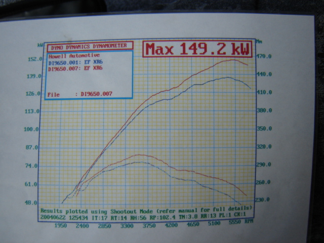 i own an xr6 99 hp jet black low ks 2 1/2 inch exhaust catco cat and just a pod first dyno 151.36 kw 2nd dyno 151 even 3rd dyno 151.62 couldnt believe my eyes , even the tech was gobbsmacked this is why he dynoed second and third this must have been a wednesday car and i am very happy