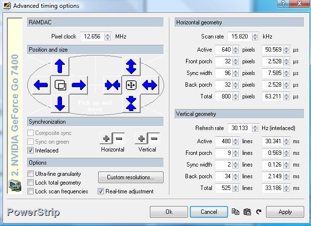 All you need is a program called PowerStrip (along with the techo document cable), i used version 3.74. the attached pic is a screenshot of the settings you need for it to work. i will post up 2moro a pic of my screen playing video from a laptop output.
