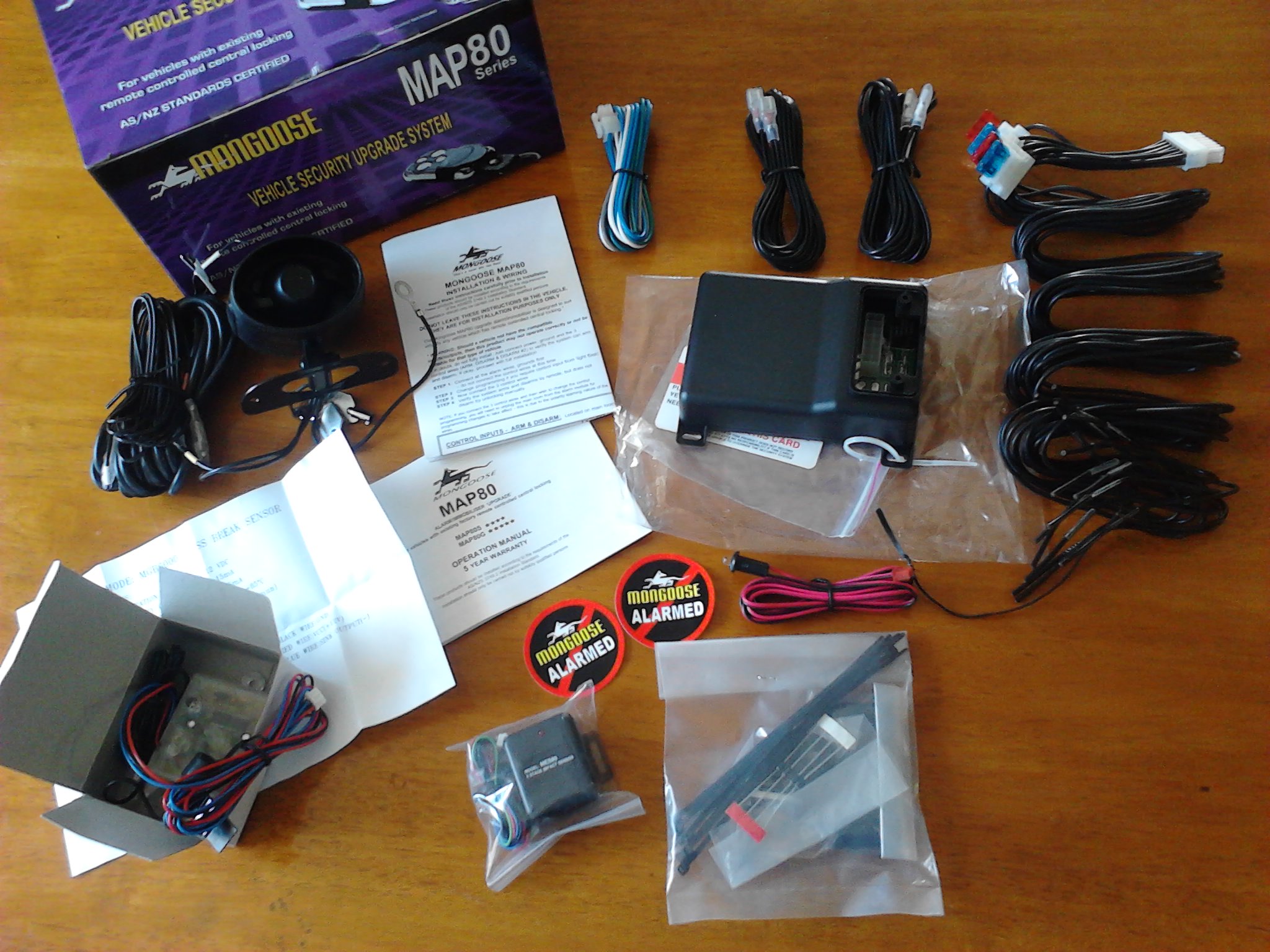 I’m installing a Mongoose MAP80G upgrade model, and hopefully this will make it a little less likely the old EF will go waltzing matilda after I have spent some time fixing everything. Having previously installed a Mongoose M80S myself (which didn’t miss a beat in 5 years) in a work vehicle I decided to stick with the brand again. I have since learnt that perhaps the 5 star rating Mongoose has (self awarded?) may be a tad overrated. The main reason for this is due to the fact that the siren is now dated, and not “digital” (controlled by the alarm module) and hence needs to be accessible to be turned off with key for vehicle service. This prevents the siren from being located in a place which is difficult for thieves to quickly access. See a review at http://vehiclesecurity.co.nz/blog/mongoose-m80-series To counteract this, a second small siren which does disarm with alarm could be hidden in a less accessible place inside the vehicle. Still, apparently the siren will still sound even in a bucket of water (I didn’t try it.. The installation instructions are average to say the least, and installation is certainly a “mission”. Unless you are an alarm installer or comfortable with vehicle wiring/electrical diagrams, you will find it requires many hours of involvement. On the plus side, doing it yourself means more time is able to be spent doing it properly (soldered connections/ hidden wiring) so it is likely to be reliable longer. It is also considered a fairly bulky unit as far as alarms go, (though it's not that big - see pic), as the immobiliser relays are built in, and there aren’t a lot of easily accessible hiding places in the EF, unless you plan on joining the wiring harness that comes with the Mongoose to make it longer. It comes with a blue LED that is so bright at night it lights up the inside of the vehicle! I may have to make up some kind of day/night sensitive relay switch just to tone it down a bit at night so it’s not like a blue light disco! This is what comes in the box: Attachment: I'm having an issue or two with the installation and will pm some previous posters in the hope of some advice, for as One Drone pointed out, it's probably not the best idea to post full details on the internet.