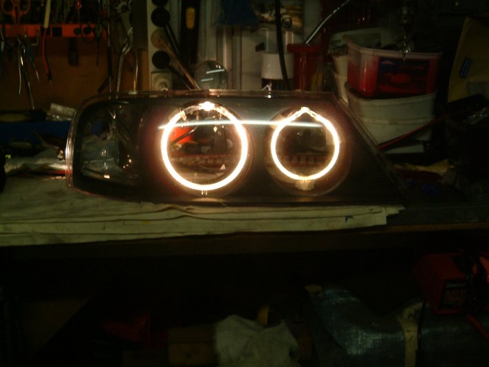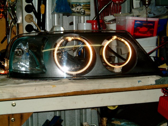 As to pulling it apart it there should be about 15 mm clearance for the assembly to fit in as well as what im told of the ballast to fit in as i thought with the battery and also the air filter box might be a problem. But hey! its a fairlane As for the angel eyes they are around 120mm and 115mm in dia and will fit in each of the light bores. camera isnt working so ill try to get a pic of the angel eyes sitting in the bores |