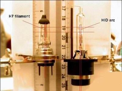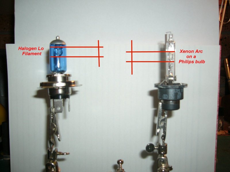 The pics of the Shield with and without the H1 bulb help a lot. If only you could take a pic of the shield with the Xenon bulbs in them then it will make life much easier on both of us. Having looked at these pics, I can tell you right away that you need to block the bottom part of your shields so NO light is reflected downwards. Any light reflected downwards would be part of the glare that is emitted from the reflectors upwards in the eyes of the oncoming traffic. Which means you need to lower your headlight setting and therefore you will have a very short beam pattern. We may need to do further adjustment to the shields or the bulbs later. But if possible try to find a piece of aluminium or something similar and block the lower part of the shields (start with one side and see what happens). Take pictures of the side you are working on with lights on approx. 1-1.5 metres from a wall - the pattern on the wall is what I am after (with the other headlight blocked – put a floor mat on it to cover the light) and take a pic from the light reflected inside the reflector – head on. So we can compare them as we go on. As you know Manufacturers of HID kits have different designs and their sizes differ from each other. Specially manufacturers from Far East Asia. To be able to see the difference between the location of the filament of a H1 and the arc (burner) of the HID bulb used in your kit, you need to take the bulb out and put it next to the H1 bulb and take a picture. Best time to see if you can get the shield out and take some pics with the HID bulb in it. I have attached a pic of a H7 and a H4 vs. Philips Xenon bulb so you can see what I mean. With a little patience and few hours of work we will give you a much better beam pattern. The correct pic from the light emitted from the inside of the reflector is also very important. By the way the what did you do with the paint you dropped in the reflector?
