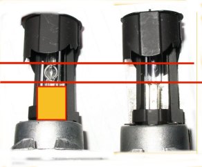 Looking at the pic, I see that there is not much difference between the location of the filament and the arc. However, the more important issue is the lower bit of H1 that is not emitting any light. The metal bit. Which of course means that you need to cover equal length of the HID bulb from the base up. The bit marked in yellow. You may need to play with the exact length until you get the best possible result. It could be a bit shorter or a bit longer than what is marked with yellow. See pic. At the moment all we are doing is testing to see what needs to be done, so any material that can withstand the heat generated by the HID bulb will do. DO NOT use anything that has paint on it. When paint gets hot and starts burning it will damage the chrome on the reflectors. Make sure that the extra shield you made does not fall into the reflector housing. Don't make anything that is permanent. As you will see we may have to adjust and readjust few times. When we have found the best possible beam pattern and it is time to make something permanent we will do something very nice. Again you could be one of the very lucky ones and our first attempt will fix the problem once and for all. Let’s hope for that. Look at the H1 bulb very carefully, what we are trying to do is to copy the exact source of light from your HID bulbs. Re the paint you did very well. Good thinking. You should NEVER touch the chrome with anything. Specially if you have a vacuum chromed plastic reflector.