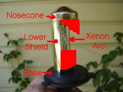 Check out the signiture mavs BTW what am i gonna say if i get pulled over?? they where there wen i bought the car In the mean time i thought id take a pic of the Globes/Tubes whateva ya wanna call them: Yes you are right it is ALL glorious glare. YES since you are prepared to work on it and spend some time it is going to be worth it. I have explained in the following pic what different parts are called so we all refer to the same name, instead of each and everyone give these bits and pieces a nick name of our own. The nosecone in your case is shaped as if it was in a complete parabolic reflector with no patterns, lines or sections in the reflector. As if it was for a Driving light reflector. But then again the manufacturer of this Aftermarket kit was not manufacturing a kit specifically for your Ford. He manufactured a one size fit all kit for all vehicles out there, As if… If you look at Hyena’s reflector, you see that although his reflector mirror has a very smooth and even shape and is almost a perfect sphere the nosecone used with that reflector has a very funny shape cut to it. The edge of the nosecone directs light to different places in the reflector and the lens brakes it so the end result is an acceptable beam pattern on the road. The shape of the nosecone edge may differ from reflector to reflector. On the other hand your lower shield is exactly what Hyena needs on his shield. But, both of you need to cover some of the lower part of the bulb facing up. From base up. The light emitted from the Arc or a filament of a Halogen bulb hits the upper part of the reflector and since it is a parabolic reflector, the light is reflected down toward the road. We need to play with the shape of these shields so we can find the best possible Cutoff line upwards and sideways. By doing this you will eliminate the glare as much as possible.