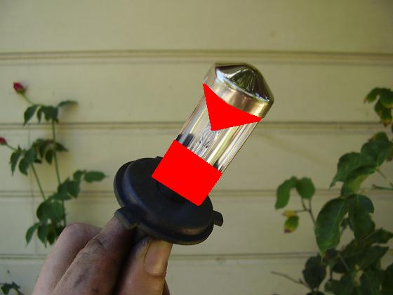 Good, for a minute I was worried there. OK, can you take a pic from the original shield from the direction of the arrow? Pic 1. Here is the glare shield used by one of the more clever bulb manufacturers. This shield has shown to work fine with almost 80% of the reflectors out there. Pic 2. I have not seen this bulb in the Land of Oz yet, but then again I have not been looking for it either. If anyone knows where to find them, please post a line on this thread. Now back to you SIM, the little I can see from the pic you posted earlier of the shield looks like it already has the pattern we need for cut off the light where it is not suppose to be. All we need to do is to scale it down to fit the shield that came with your HID bulb. Then we need to fine tune it until we get an acceptable beam pattern.