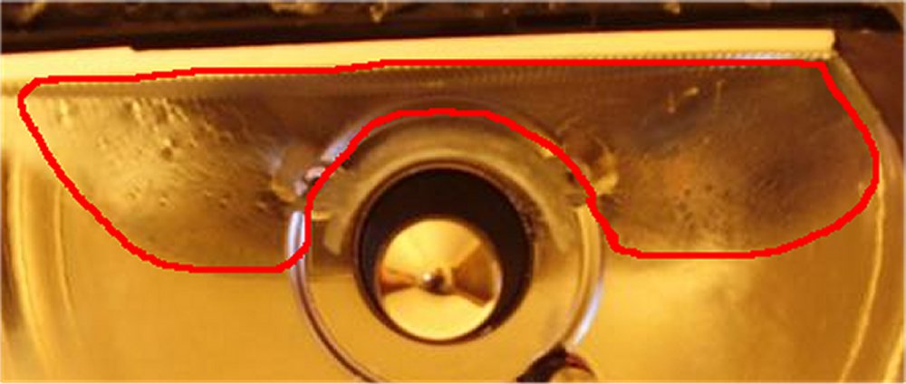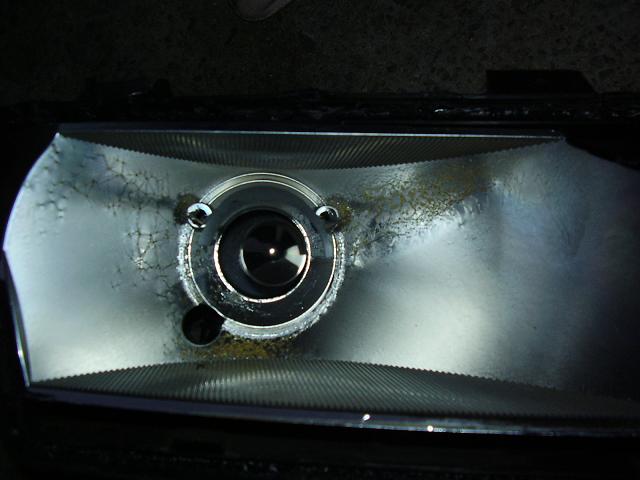 Thank you also for your kind comments. OK, here a few more question for you: 1- Did you have the original shield in or out, when you took the pics you posted earlier? 2- Looking at the passenger side reflector, it also looks burnt. See pic. 3- How clear is the lens? Any scratches on the inside after all the rubbings etc. 4- Did you find out which side was reflecting the glare?