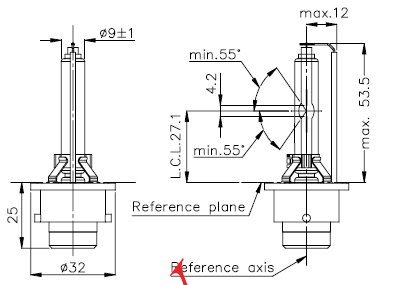 Presently, these are the different types of HID bulbs available for use in the Automotive industry: D1S, D1R, D2S, D2R, D4S and D4R. S version is without shield and used normally in conjunction with Reflectors. R version has a shield just under and on the side of the arc and is used mainly in conjunction with Projectors. S version has: 3200 Lumen 4250K R version has: 2800Lumen 4150K The length from the base to light centre of the arc is: 27,1 +/- 0.15mm Diameter of the bulb is: 9.1mm Total free length needed for use in a shield is: 60.00mm Arc length is: 4.2mm Arc diameter is: 1.1mm Material used in the bulb is: UV stop quartz The outer jacket of the bulb prevents transmission of harmful UV. Therefore plastic lens can be used in conjunction with HID system. Max operating Temperature of the bulb is 700°C. Max Temperature at the base/socket is 240°C. Max Temperature at the pinch is 400°C. Power 35W. Voltage 85. Ignition Voltage 23kV. Starting current is 26A. Running current is 2-4A. Run-up time is 1.3s. 75% of lumen is maintained for 1500 Hours. Pressure inside the lamp cold state is 7bar. Pressure inside the lamp hot state is 100bar. Safety UV glasses and gloves are to be worn when working with HID bulbs. Defective bulbs are to be disposed of a Special Waste.