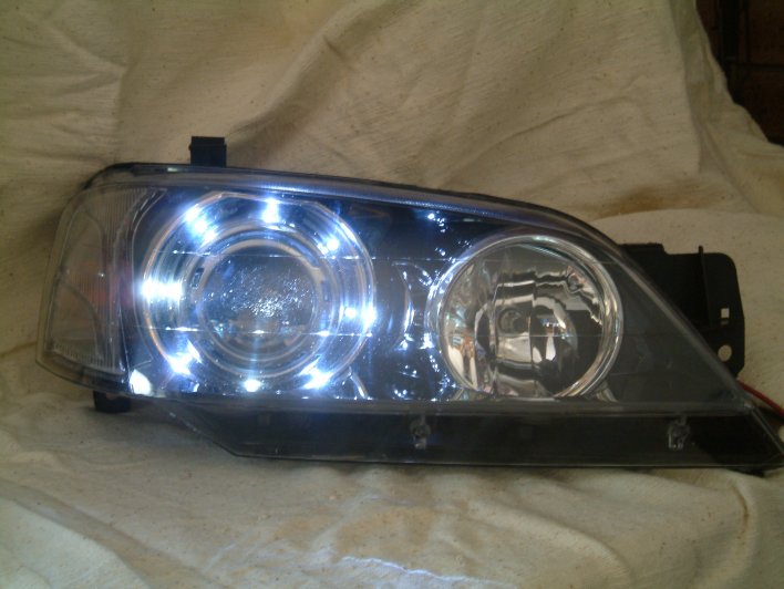 That will fix the Hi/Lo or flashing problems. I think I mentioned something about this like 10-15 pages ago on this thread. I am right in middle of retrofitting a complete AFS(Active Light System) on a Falcon BA. With all the sensors gizmos and gadgets and Dynamic Range Adjustment, Cornering Light System etc. etc. I have started on a Tech Manual for how to retro THE Standard (not all the gizmos i.e. self levelling, dynamic range adjustment etc.) version of the process and as soon as it is done I may post it on this forum. Here is few teasers of how it (should) look. Notice the shroud/bezel? Notice the LED Parking Lights? Notice the beautiful colours on top of the cutoff line. That is how you get colours. Not by buying a higher Kelvin TOY.