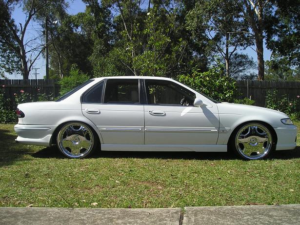picked these up last monday week in canberra..($1800 off ebay) slightly used but rims in imaculate condition.. tyres 95% tread.. Tyres allready WHITE WALLED! Origianlly fitted to a HONDA ACCORD 2001 model.. same offset and stud pattern as the au-ba falcon.. ive retained my hub adapters to run these.. tyre size on these are 225/30/20.. and have surprisingly more room inside the wheel arch then the old 245/35/19s... i was unsure at 1st how the rims would look on my car... but is growing on me pretty quickly.. wanted a classy/pimp style rim to suit my pimped out fairmont..