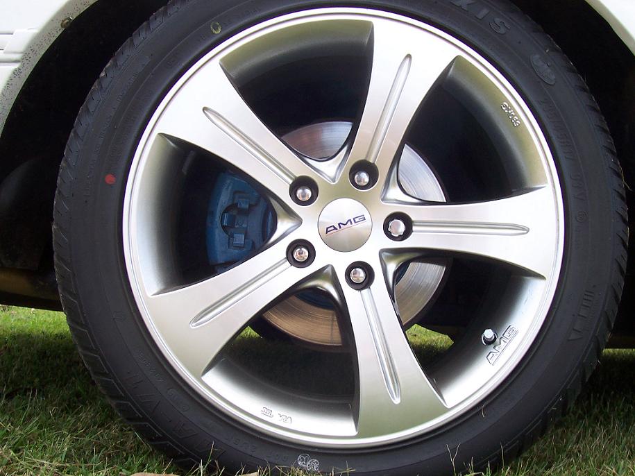 hey there, well finally i was able to get enoughf money together to get me some new wheels and upgrade from hubcaps. these pics were taken this morning. they are !7" AMG Qaukes in shadow chrome. i also decided to paint my callipars from that light blue to dark blue. let me know what you guys think, cheers