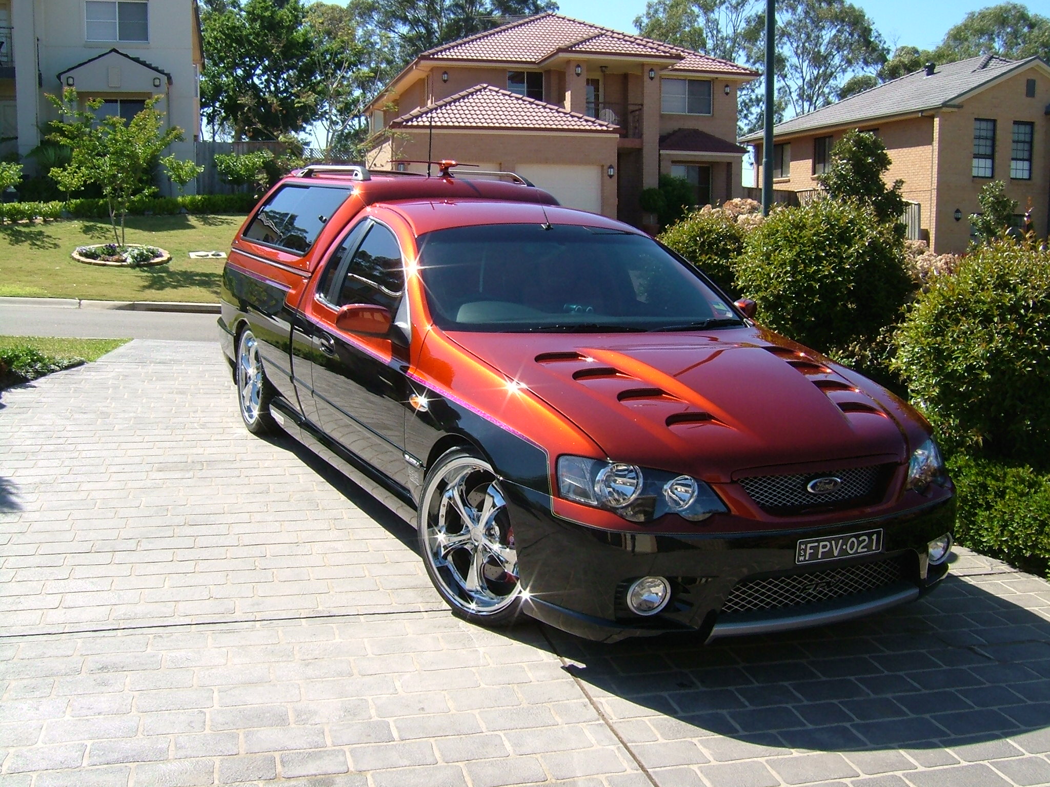 The car is featured on the HOK website for its Overlay Paint work - lot more paint work went into the car than detailed on the HOK editorial - basically what they are indicating is that you can get an overlay paint job for around $6000. Mine was quite a bit more than that due to the canopy and also I brought the Kandy Tangerine onto the front bumper - Meguiar's are also featuring the car in its advertising in Car Magazines. Australian Utes will be doing a feature story on the car at a later date. Traded the GT in on the Super Pursuit - was happy with the trade otherwise would not have done the deal - as always, would have liked a bit more money but you have to be realistic in this world - anything is only worth what someone is willing to pay for it. The bonnet certainly gives the car an aggressive look - it is one of those things - you either like it or don't. I had the bonnet built to suit my requirements. Due to the large costs involved in making the bonnet I am making it available for sale - have to try and get some of the costs back. The total investment in the bonnet is close to $15,000 so it would be good to get some of it back and at the same time make it available for others who might wish to update their BA/BF Ford. Ciao - James