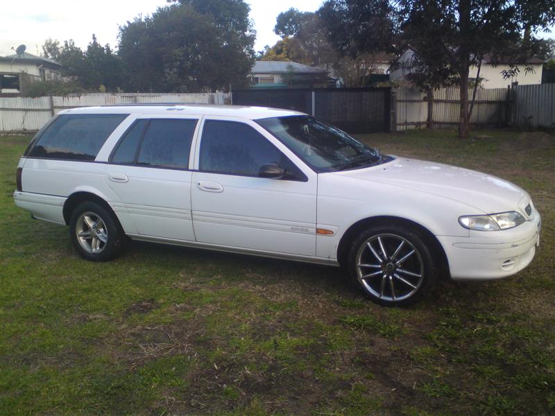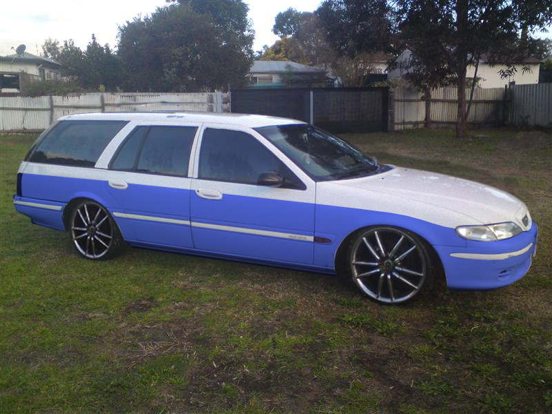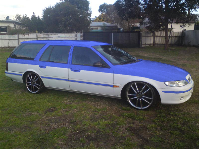 {USERNAME} wrote: Ok - *I* dont like it, but here it is-ish: Attachment: wagonstyle.jpg {USERNAME} wrote: Hi mate could you lower it, put the front rims on the back and make them bigger and 2tone it a metallic blue roof to handles and white doors with the mould the same blue. cheers can make the rims bigger and put the blue side moulds on please?? eg front bar, doors, rear bar and tail gate panels... than maybe reverse it so its blue bottom white top.. cheers lurch good work
