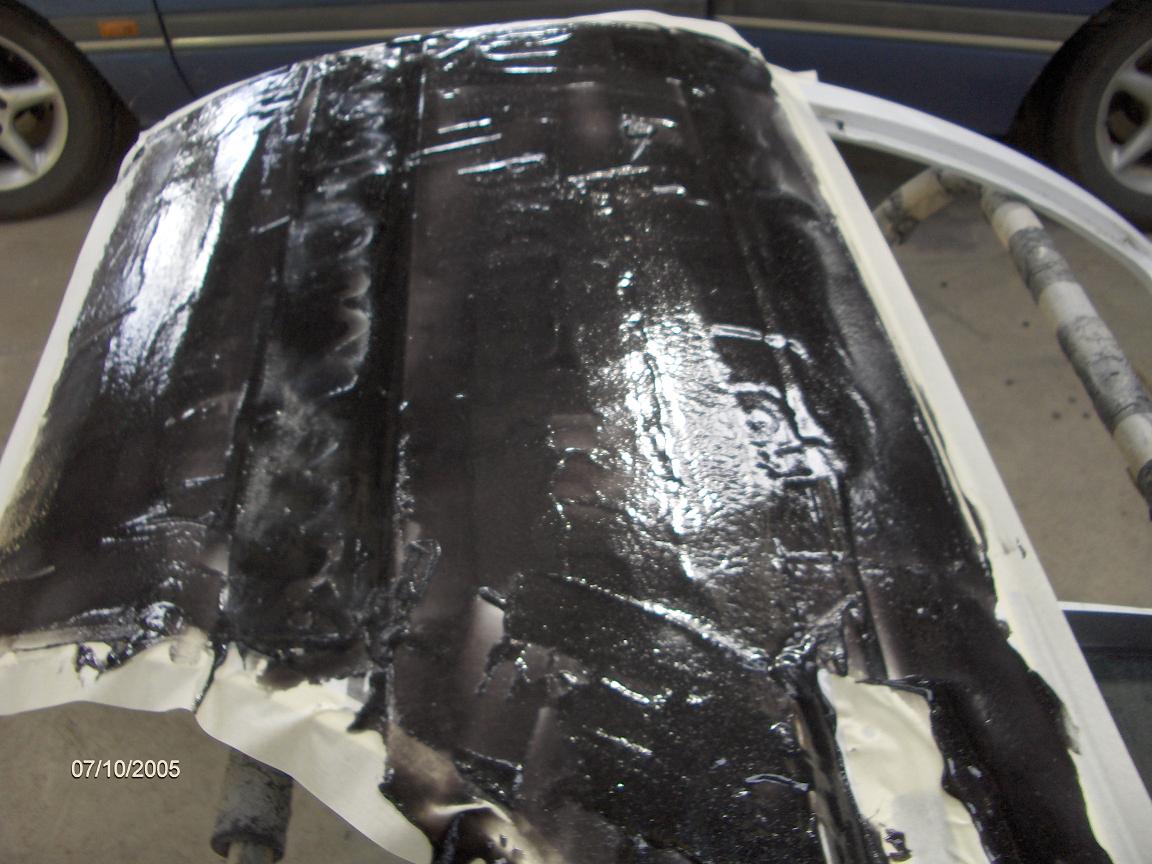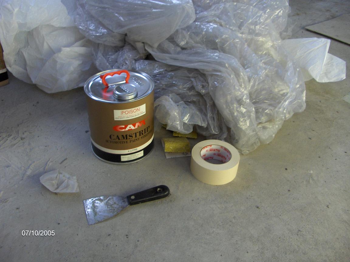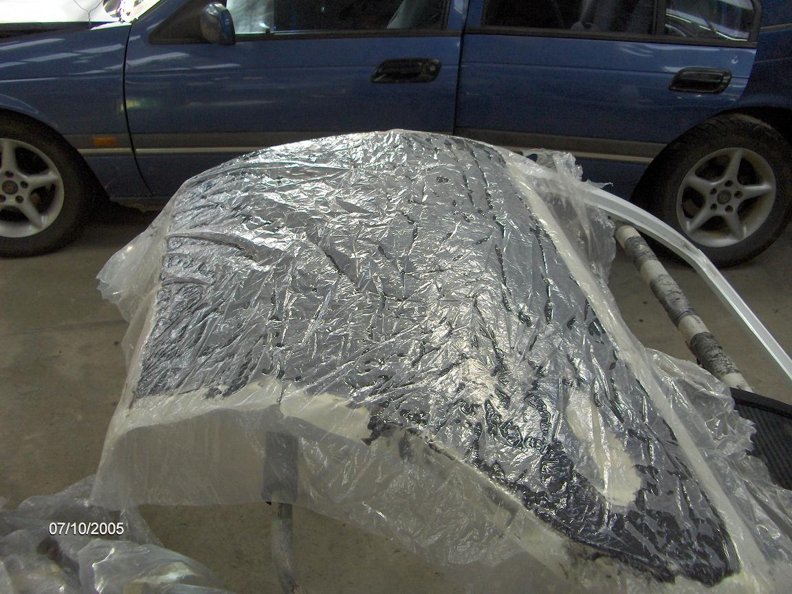 started paint stripping today, only found one old repair on a door which i thought was full of bog so im pretty happy! Images are in order to show everyone whats involved in paint stripping. You scuff up where you are stripping with some 36 grit paper, and mask about 10mm in from all edges to stop it running down the inside of the panel where you dont want 2 strip. You then spread it out evenly and fairly thick, better using a bit too much and doing it once properly than stuffing around having to do it twice, put plastic over it once its spread, this keeps the fumes in and supposedly makes it work quicker, leave it about 15 minutes or half an hour, then scrape it off into the plastic and throw it away, any paint left over, eg on edges is machine sanded off later.