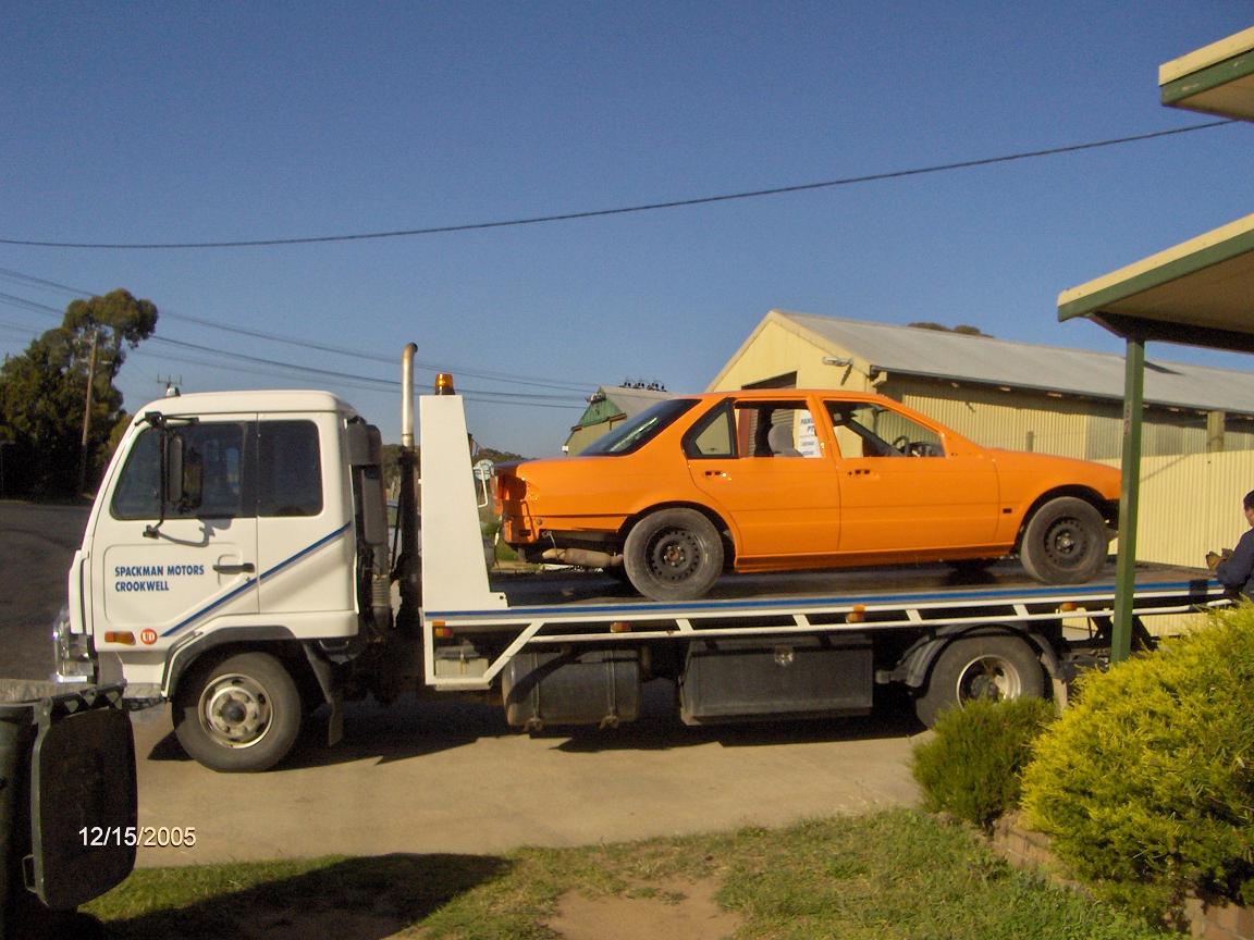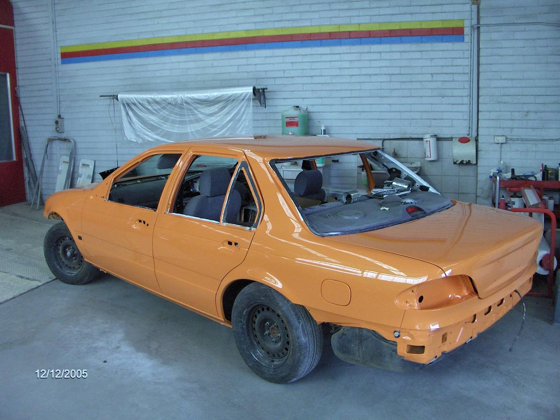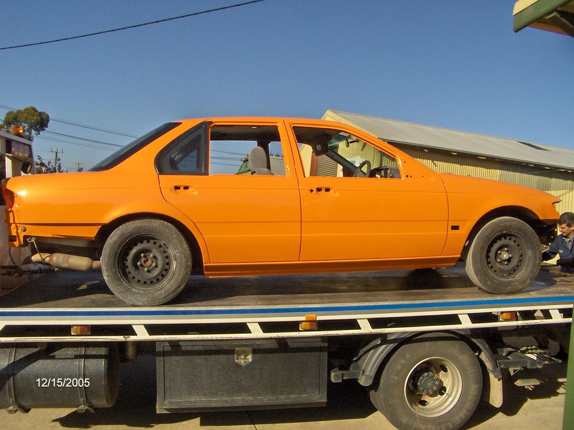 Nah not a lot of progress since those pics, rear window is back in and rear 1/4 glass windows, am getting it taken home tomorrow so I can put the rest of it together, motor, box, brake lines, wiring etc etc etc, hehe doesnt look much like a white fairmont anymore, will have EL XR front, no kit or spoiler, no boot lock, no badges