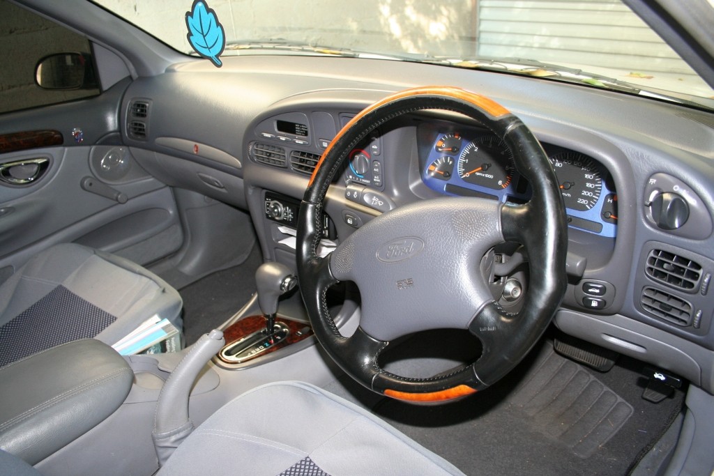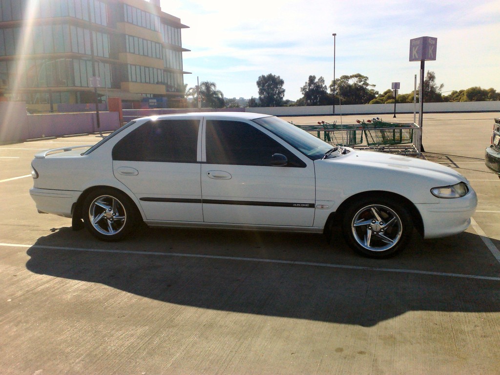 97 dressed up EL Falcon. DF/DL woodgrain, leather and chrome bits and bobs (gear shifter, handbrake), XR cluster. Chromed XR rims on 225s. Pedders sports suspension. DF/DL clear side repeaters, Fairmont GHIA boot chrome thingo, blacked out windows, clear tail lights with GLOBEs - not stupid LEDs. Next week will be putting in leather seats from a Fairmont GHIA