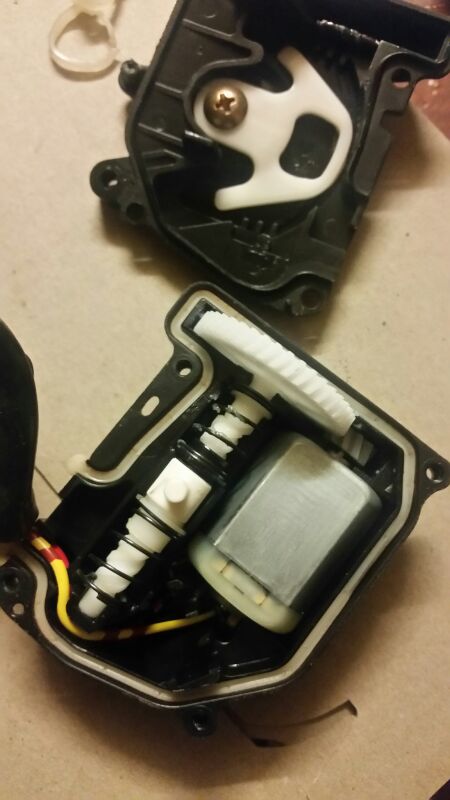 First step is removing the two scews holding the actuator to the lock mechanism and cut the two zip ties holding the wiring then you can remove the four screws holding the actuator body together,remove cover to reveal the actuator motor and gears/springs.