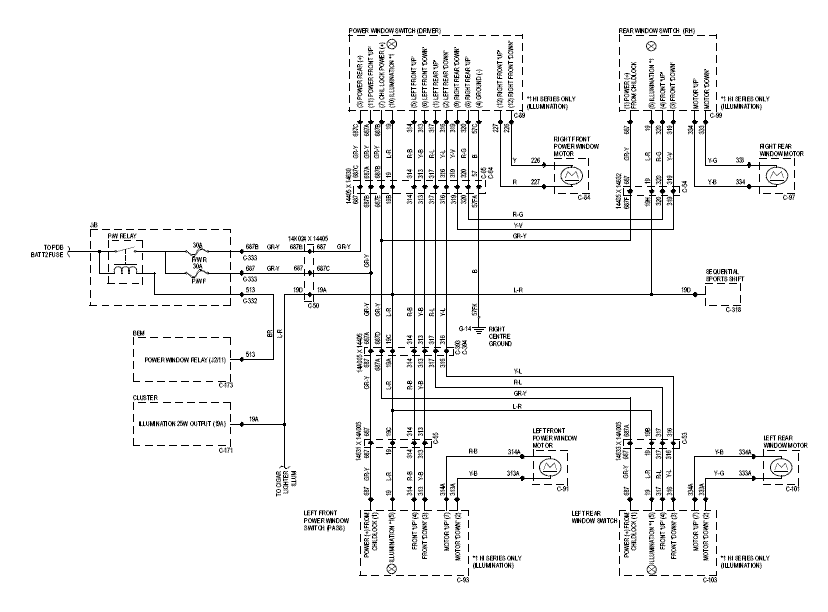 You do need to ensure your motors are lifting okay, and not straining, as they won't fully wind up, otherwise. One thing I did find with them is that they only seemed to work using positive trigger and not negative trigger (which Falcons use). No big deal as you can use a 5 pin relay to rectify this. OK, now this makes sense. The BEM provides a controlled power source for the windows. Pin J2/11 on the BEM drives high when the Power Windows are to be active. This connects into the back of the Fuse Box, which triggers Power Window Relay through two 30A Fuses (Fuse 31 is for the Front Power Windows and Fuse 32 is for the Rear Power Windows.) The Front P/W line is fed direct to both front switches. The Rear P/W Line is fed via the Drivers P/W Childlock Switch, and then to the rear two switches. This provides Power to all switches. The Illumination Line from each switch feeds back to the Drivers Switch. The Drivers Switch is grounded to chassis centre earth. This completes the illumination circuit, and this GND is also used to complete the other circuits. The Drivers Window Child-Lock switch also disconnects earth for illumination so the rear lights go off. So the lines from the Drivers Switch and the other switches are all about switching Ground to the Power Window motors. It's not quite 'negative triggered' to me as I come from a digital signalling world where that means something different - but now I know what you mean by it. I would have used the term 'Ground Switched'. So some notes. (1) I should be able to activate the Power Window 'Power' lines by providing a line-in to the power window relay in the fuse box. This will mean preventing feed-back to the BEM, but nothing a little Zener Diode couldn't fix. HOWEVER, I'd also need to bypass the Child Lock switch for the rear windows and this might be trickier. (2) When rear-switches are used, I can't quite see how to 'close' the circuit. One of the 'front up' or 'front down' lines that come from the front switch must always connect through to GND, or else the switches themselves have local GND. Lukeyson Last edited by Lukeyson on Tue Jul 10, 2007 11:27 pm, edited 2 times in total. |