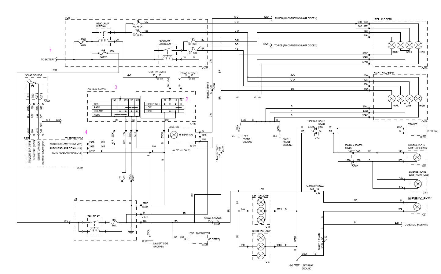 So what appears to happen is: (1) Power is supplied from battery (2) Stalk is at Permanent Low (could be permanent high or flash high. Flash High has it's own earth. Permanent settings depend on rotary dial setting) (3) Rotary Dial - either earth the light settings for parkers/headlights, or pass headlight earth through to BEM controlled GND (4) BEM controls the Earth by using the auto on/off settings. This is all the low-power side of the low/high headlight relays and the tail relay. HOWEVER, there's also a line (1416) that appears to run from the switch to the Cluster - which would most likely be the line that tells the cluster whether auto-lights are on or not - so the IC stops b**ch if the lights are left on when ign is off (which my low cluster does annoyingly.) So it now appears wired to BOTH the BEM and the IC. Lukeyson